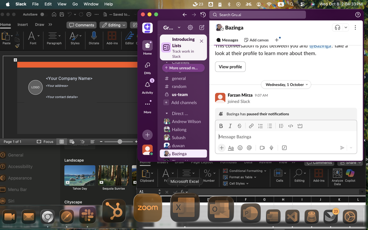 19 | mac | 1,728 | 1,117 | click | the Slack application window with dark purple interface partially visible behind the System Settings window, showing the conversation with Andrew Wilson. Located in the bottom-left to center-left area of the screen, with its sidebar and chat area visible behind the settings panel. | 0 | 558 | 433 | 558 | 433 | 991 | 0 | 991 | null | null | null | null | null | null | null | null | null | Target: the Slack application window with dark purple interface partially visible behind the System Settings window, showing the conversation with Andrew Wilson. Located in the bottom-left to center-left area of the screen, with its sidebar and chat area visible behind the settings panel. | |