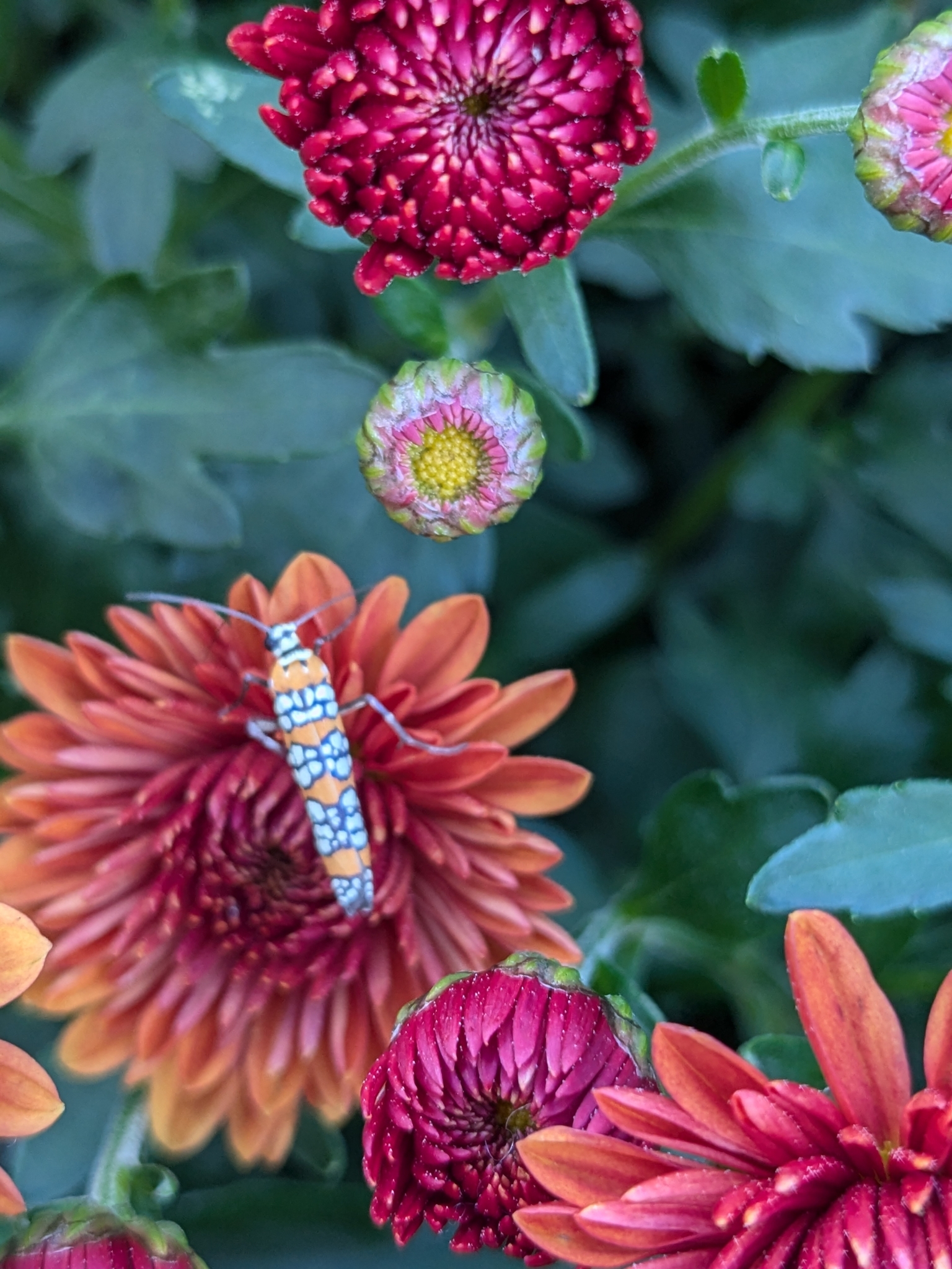 Atteva punctella | species | Chrysanthemum | genus | visitsFlowersOf | Animalia | Arthropoda | Insecta | Lepidoptera | Attevidae | Atteva | Plantae | Tracheophyta | Magnoliopsida | Asterales | Asteraceae | Chrysanthemum | 40.613885 | -80.092199 | 2024 | 10 | 13 | http://creativecommons.org/licenses/by-nc/4.0/ | https://www.inaturalist.org/observations/247190822 |