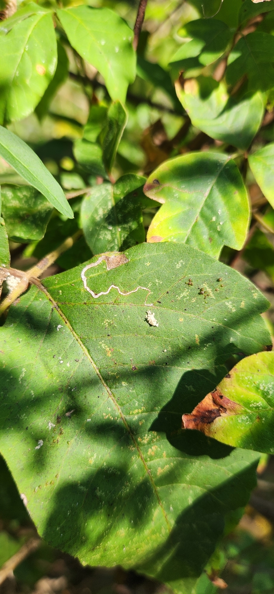 Stigmella rhoifoliella | species | Toxicodendron radicans | species | interactsWith | Animalia | Arthropoda | Insecta | Lepidoptera | Nepticulidae | Stigmella | Plantae | Tracheophyta | Magnoliopsida | Sapindales | Anacardiaceae | Toxicodendron | 30.981217 | -91.487925 | 2024 | 10 | 13 | http://creativecommons.org/licenses/by-nc/4.0/ | https://www.inaturalist.org/observations/247156568 | |