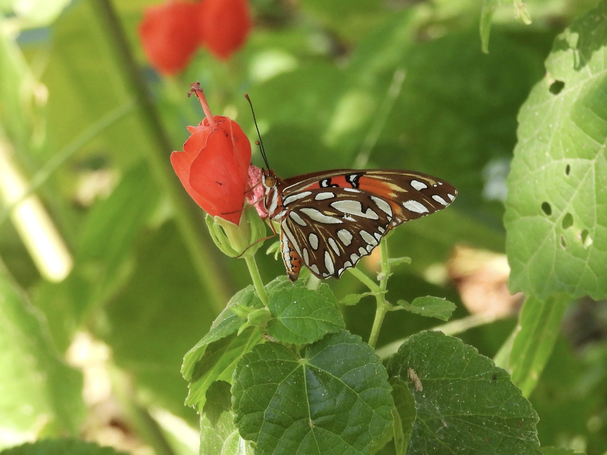 Dione vanillae | species | Malvaviscus arboreus | species | eats | Animalia | Arthropoda | Insecta | Lepidoptera | Nymphalidae | Dione | Plantae | Tracheophyta | Magnoliopsida | Malvales | Malvaceae | Malvaviscus | 33.023955 | -97.14572 | 2024 | 10 | 12 | http://creativecommons.org/licenses/by-nc/4.0/ | https://www.inaturalist.org/observations/247166252 | |