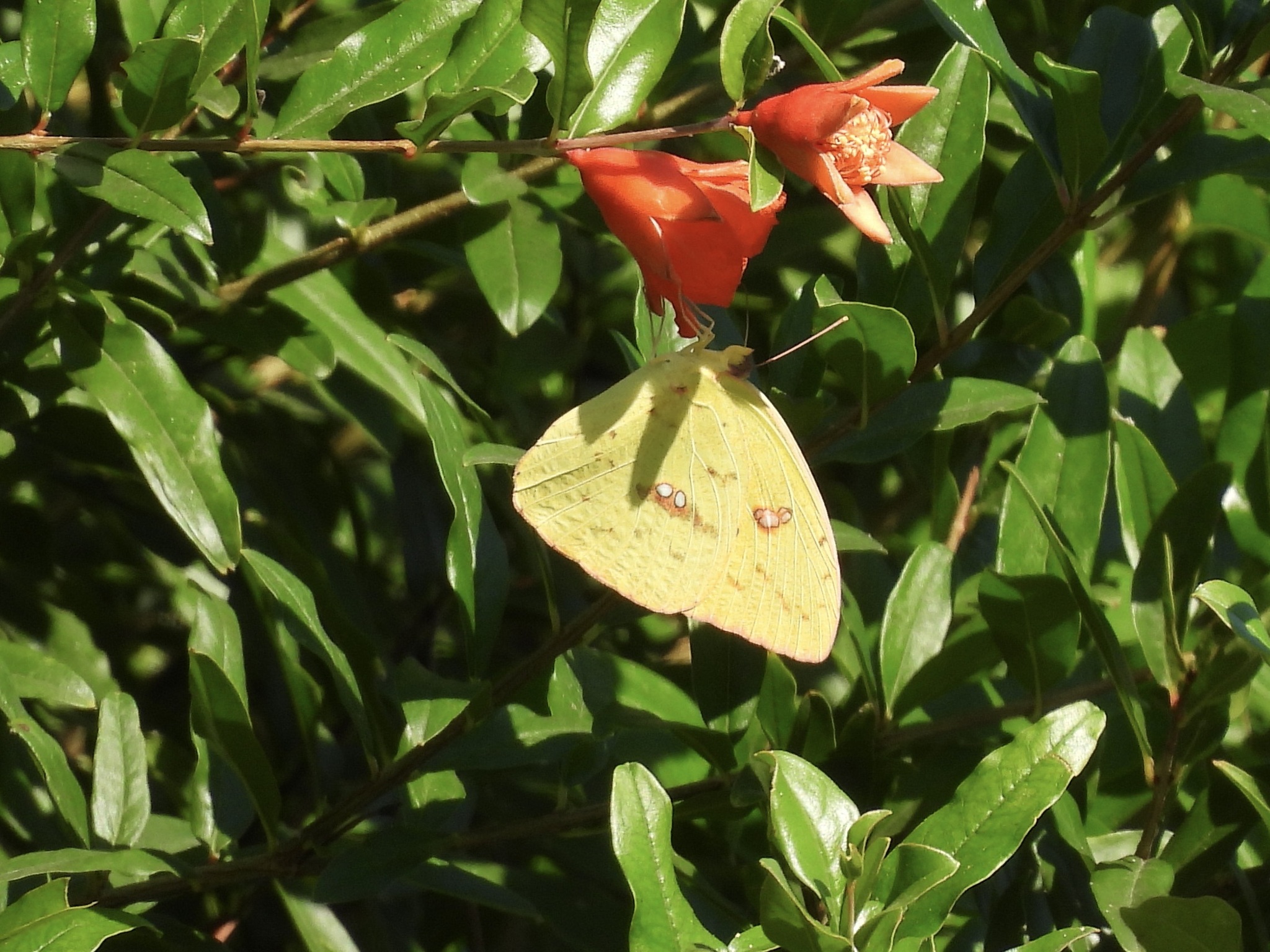 Phoebis sennae | species | Punica granatum | species | eats | Animalia | Arthropoda | Insecta | Lepidoptera | Pieridae | Phoebis | Plantae | Tracheophyta | Magnoliopsida | Myrtales | Lythraceae | Punica | 33.023955 | -97.14572 | 2024 | 10 | 13 | http://creativecommons.org/licenses/by-nc/4.0/ | https://www.inaturalist.org/observations/247166306 | |