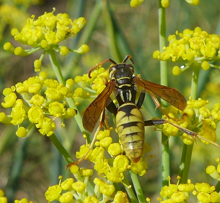 Polistes aurifer | species | Foeniculum vulgare | species | interactsWith | Animalia | Arthropoda | Insecta | Hymenoptera | Eumenidae | Polistes | Plantae | Tracheophyta | Magnoliopsida | Apiales | Apiaceae | Foeniculum | 38.449354 | -122.831182 | 2013 | 10 | 7 | http://creativecommons.org/licenses/by/4.0/ | https://www.inaturalist.org/observations/421524 |