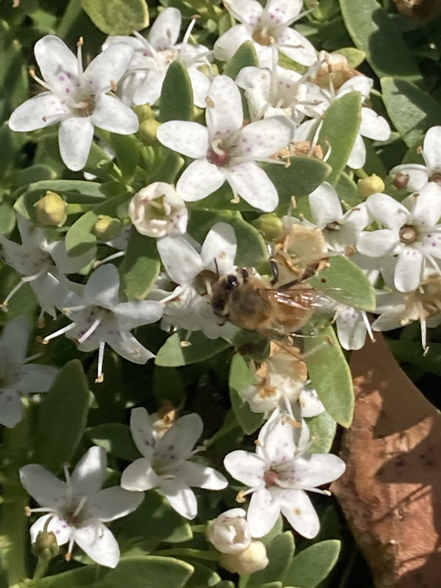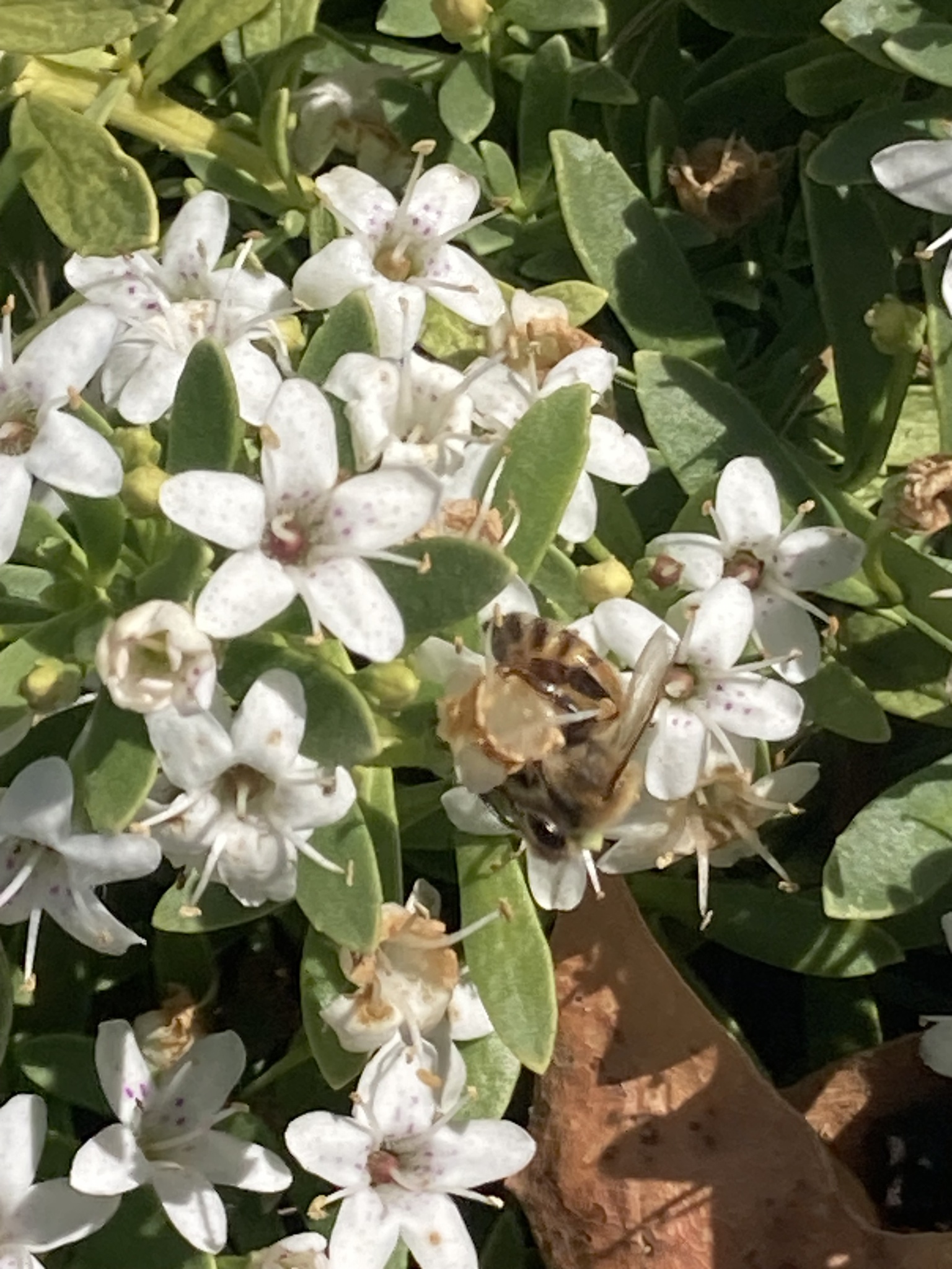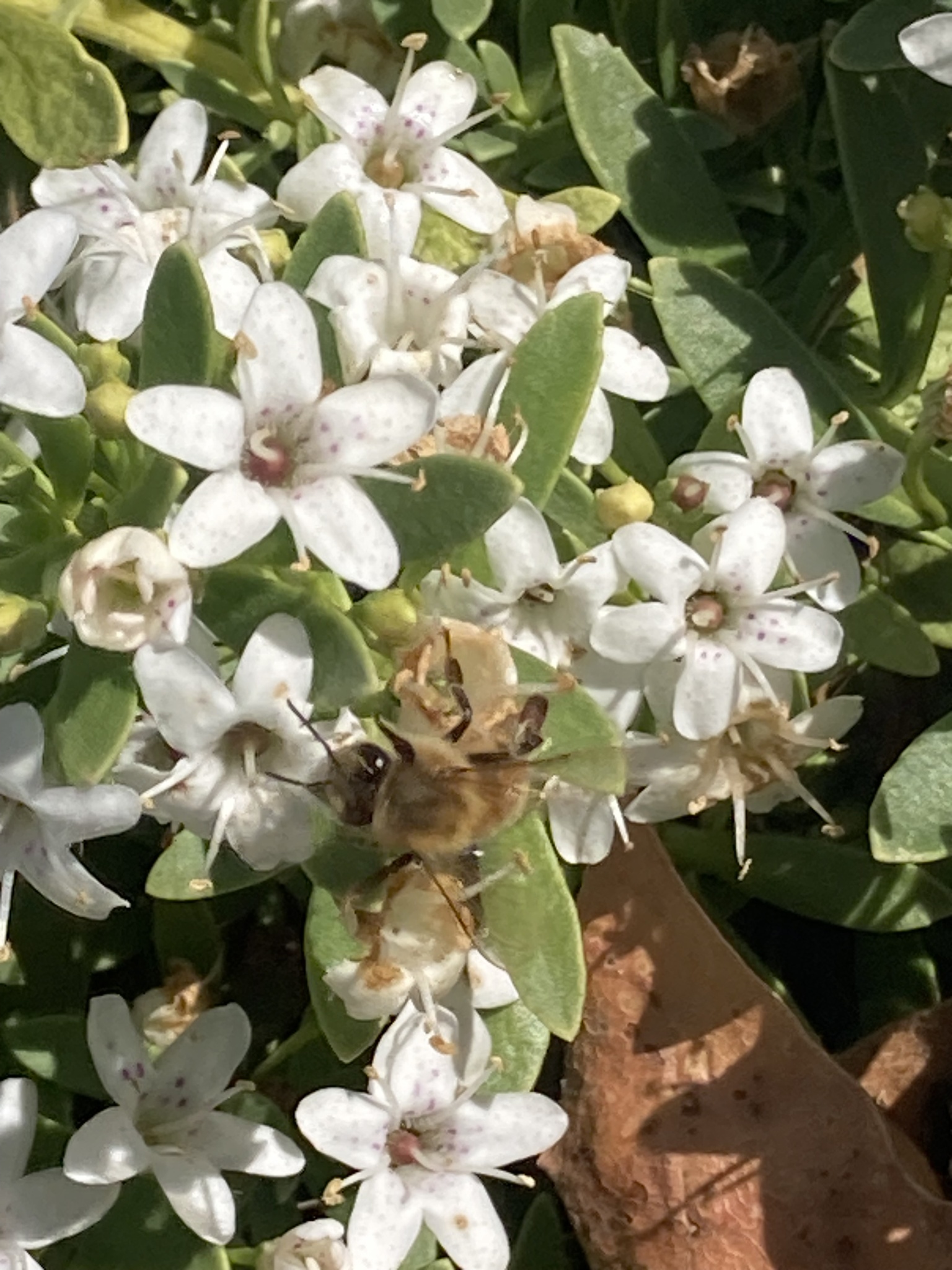 Apis mellifera | species | Myoporum parvifolium | species | eats | Animalia | Arthropoda | Insecta | Hymenoptera | Apidae | Apis | Plantae | Tracheophyta | Magnoliopsida | Lamiales | Scrophulariaceae | Myoporum | 38.361195 | -121.965767 | 2023 | 6 | 2 | http://creativecommons.org/licenses/by-nc/4.0/ | https://www.inaturalist.org/observations/165184695 | |