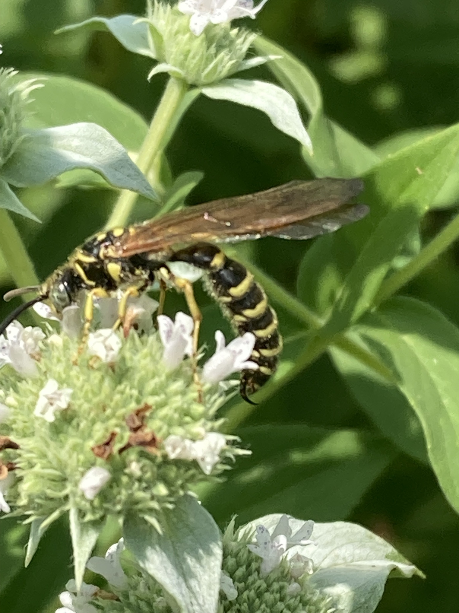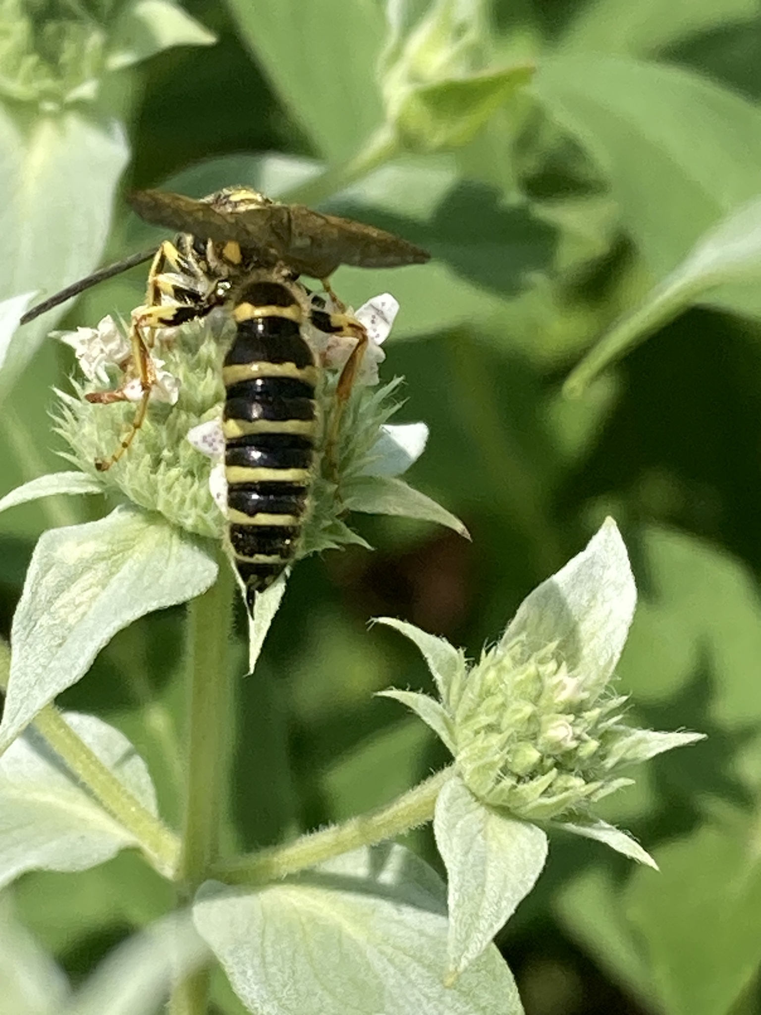 Myzinum quinquecinctum | species | Pycnanthemum | genus | visitsFlowersOf | Animalia | Arthropoda | Insecta | Hymenoptera | Tiphiidae | Myzinum | Plantae | Tracheophyta | Magnoliopsida | Lamiales | Lamiaceae | Pycnanthemum | 32.618288 | -93.732653 | 2023 | 6 | 2 | http://creativecommons.org/licenses/by-nc/4.0/ | https://www.inaturalist.org/observations/165167048 | |