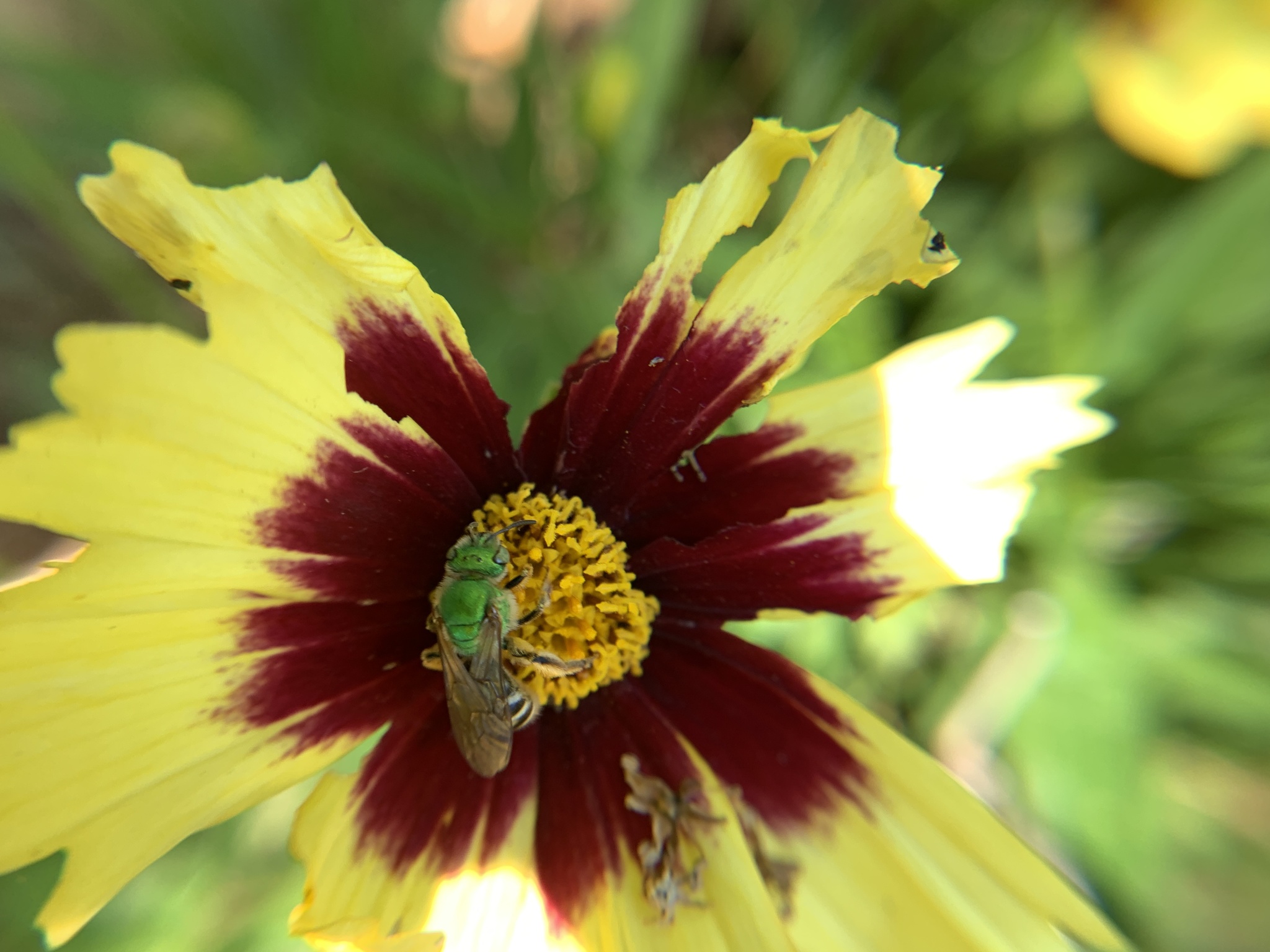 Agapostemon virescens | species | Coreopsis tinctoria | species | visitsFlowersOf | Animalia | Arthropoda | Insecta | Hymenoptera | Halictidae | Agapostemon | Plantae | Tracheophyta | Magnoliopsida | Asterales | Asteraceae | Coreopsis | 42.677226 | -83.056839 | 2021 | 6 | 15 | http://creativecommons.org/licenses/by-nc/4.0/ | https://www.inaturalist.org/observations/83176017 | |