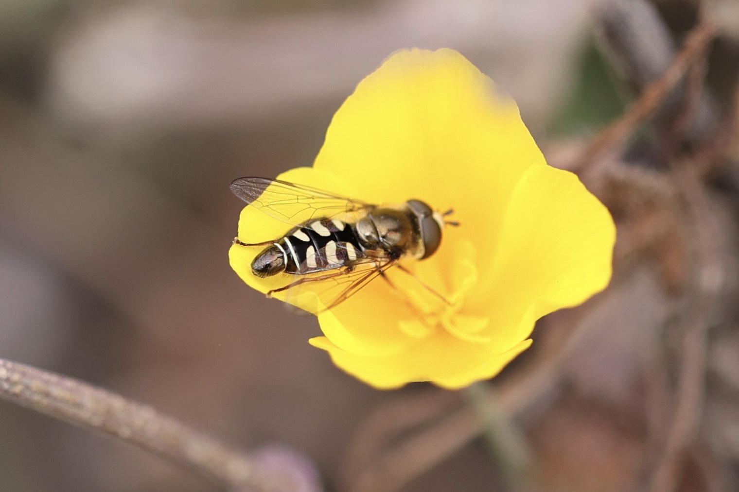 Eupeodes volucris | species | Eschscholzia californica | species | visitsFlowersOf | Animalia | Arthropoda | Insecta | Diptera | Syrphidae | Eupeodes | Plantae | Tracheophyta | Magnoliopsida | Ranunculales | Papaveraceae | Eschscholzia | 32.67213 | -117.2448 | 2023 | 5 | 31 | http://creativecommons.org/licenses/by-nc/4.0/ | https://www.inaturalist.org/observations/164914010 | |