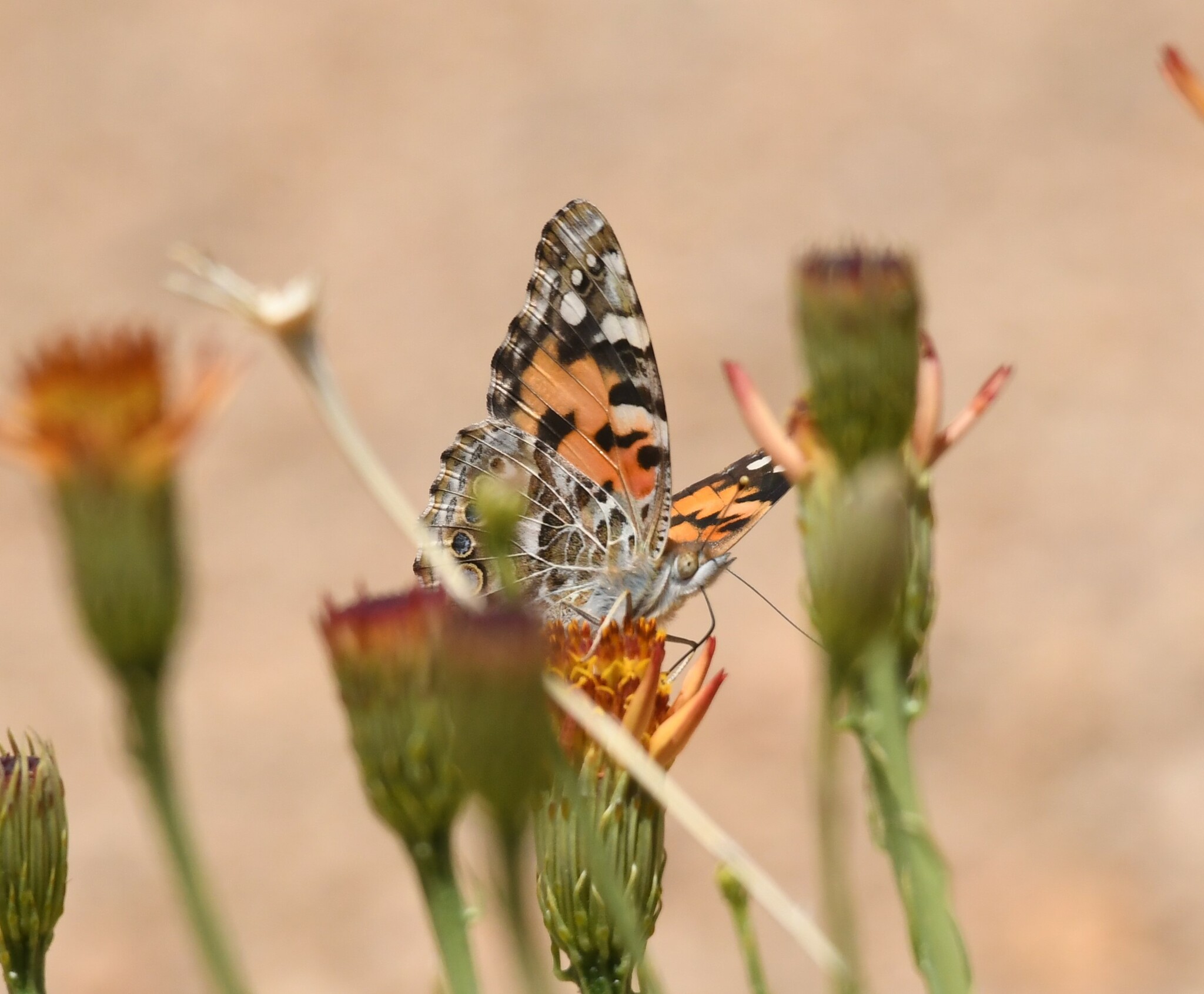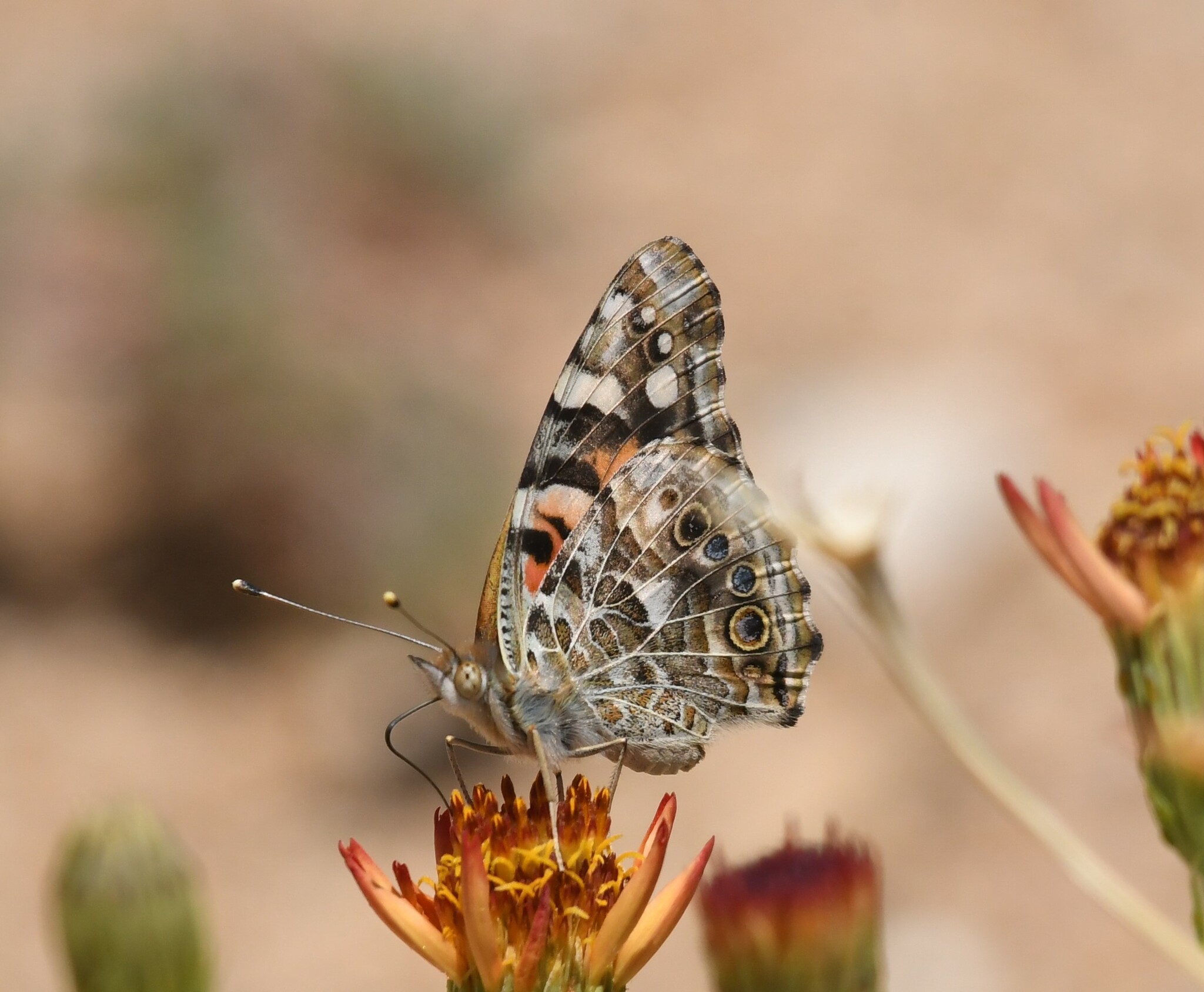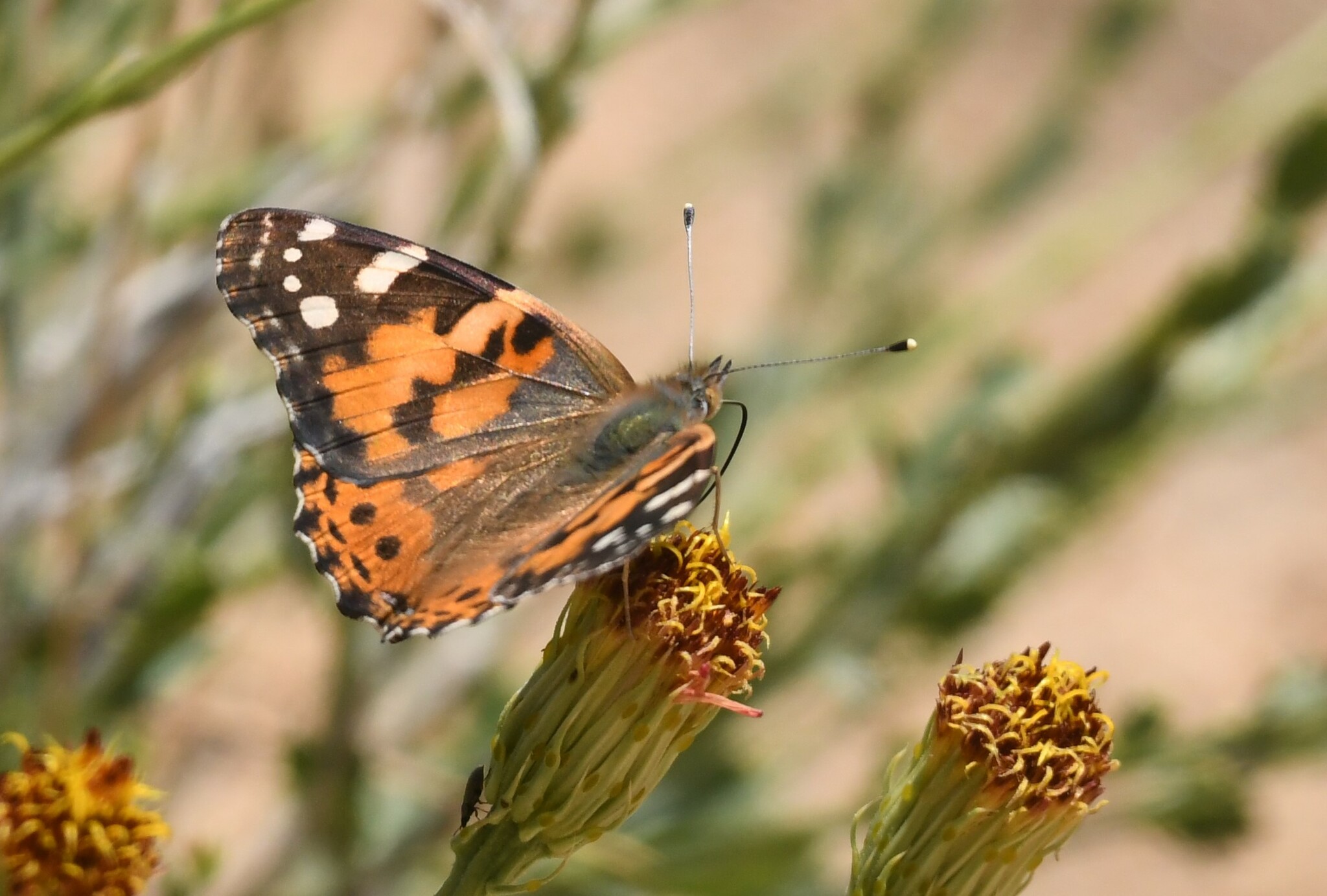 Vanessa cardui | species | Adenophyllum cooperi | species | visitsFlowersOf | Animalia | Arthropoda | Insecta | Lepidoptera | Nymphalidae | Vanessa | Plantae | Tracheophyta | Magnoliopsida | Asterales | Asteraceae | Adenophyllum | 34.030831 | -116.14629 | 2023 | 5 | 28 | http://creativecommons.org/licenses/by-nc/4.0/ | https://www.inaturalist.org/observations/164915123 | |