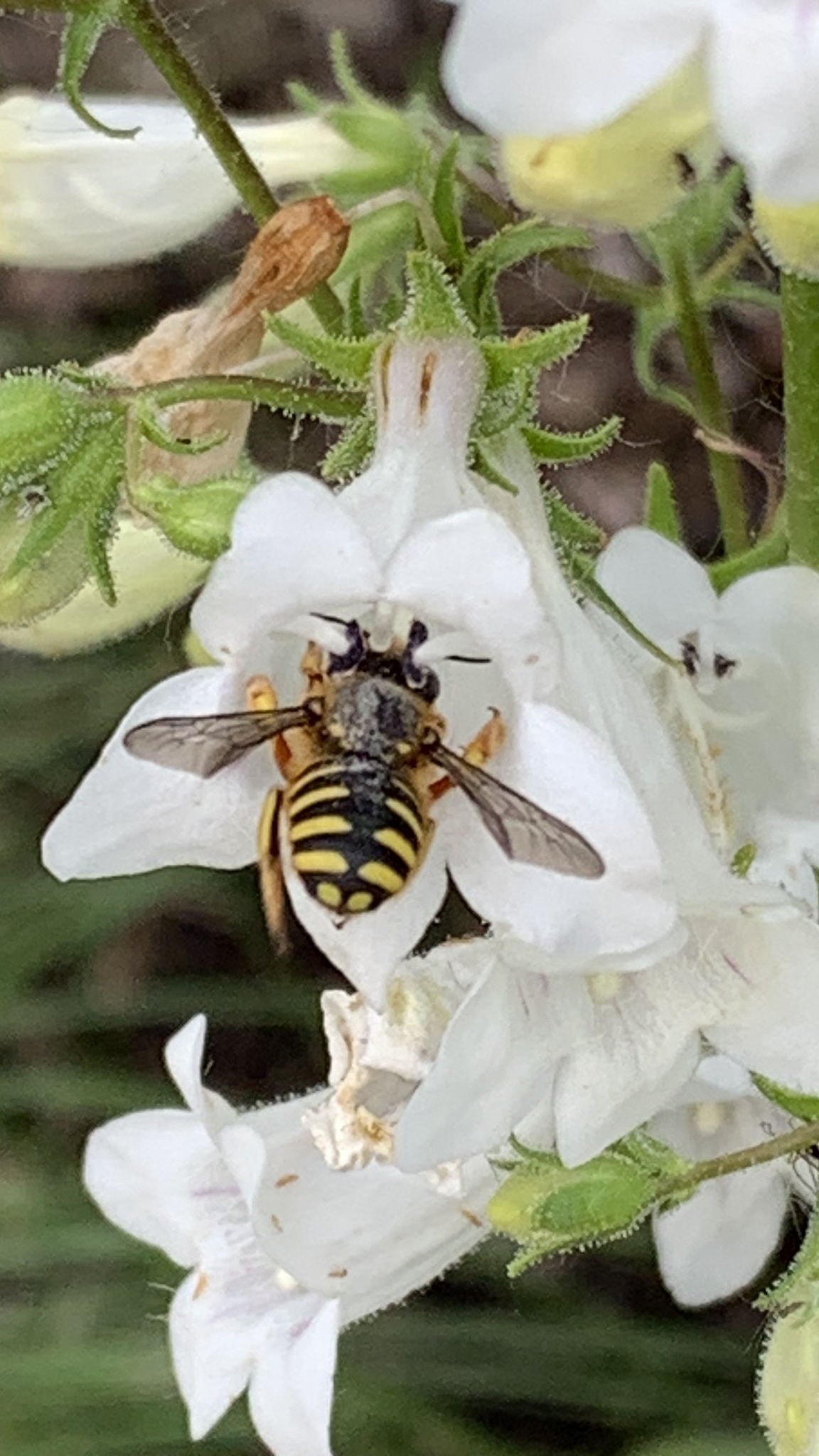 Anthidium manicatum | species | Penstemon | genus | visitsFlowersOf | Animalia | Arthropoda | Insecta | Hymenoptera | Megachilidae | Anthidium | Plantae | Tracheophyta | Magnoliopsida | Lamiales | Plantaginaceae | Penstemon | 40.501267 | -88.969742 | 2023 | 5 | 31 | http://creativecommons.org/licenses/by-nc/4.0/ | https://www.inaturalist.org/observations/164922326 | |