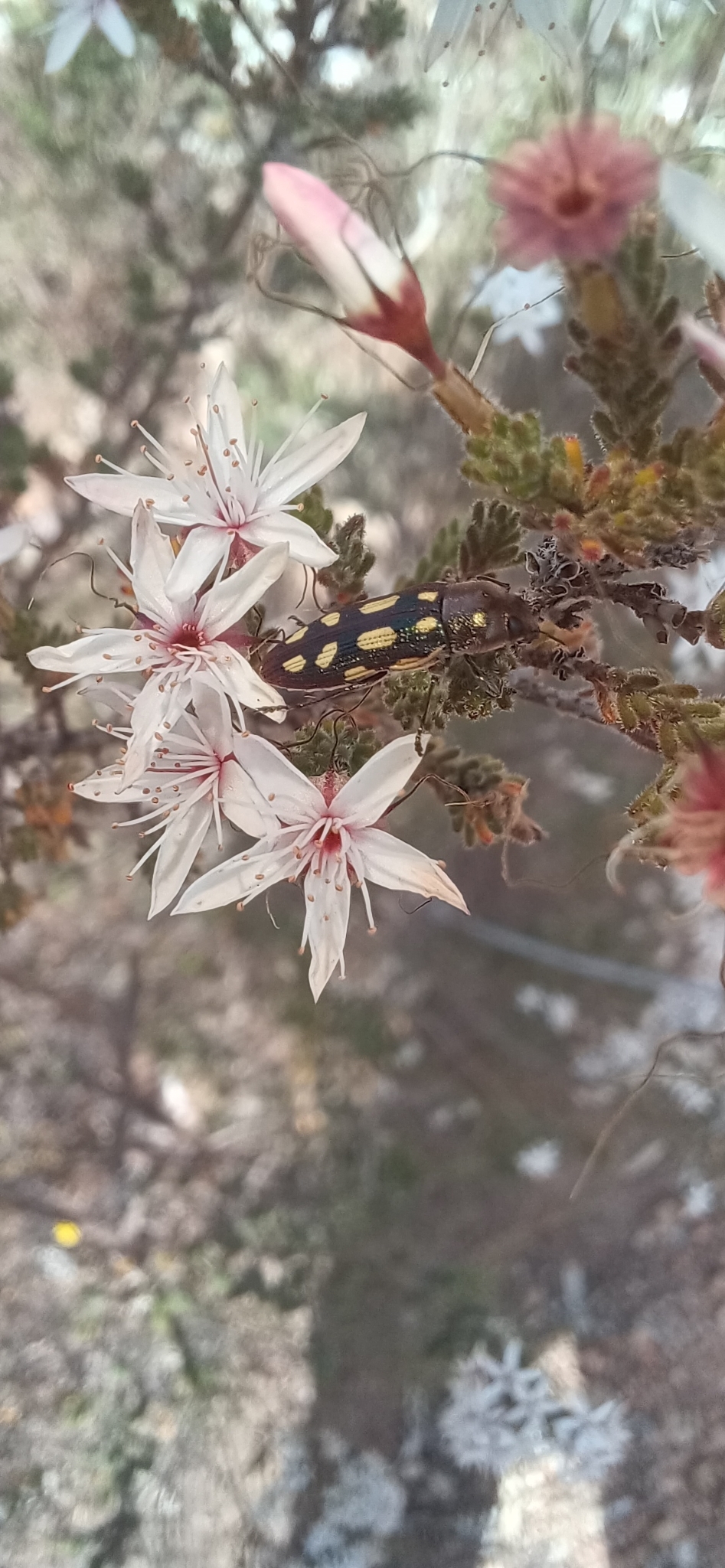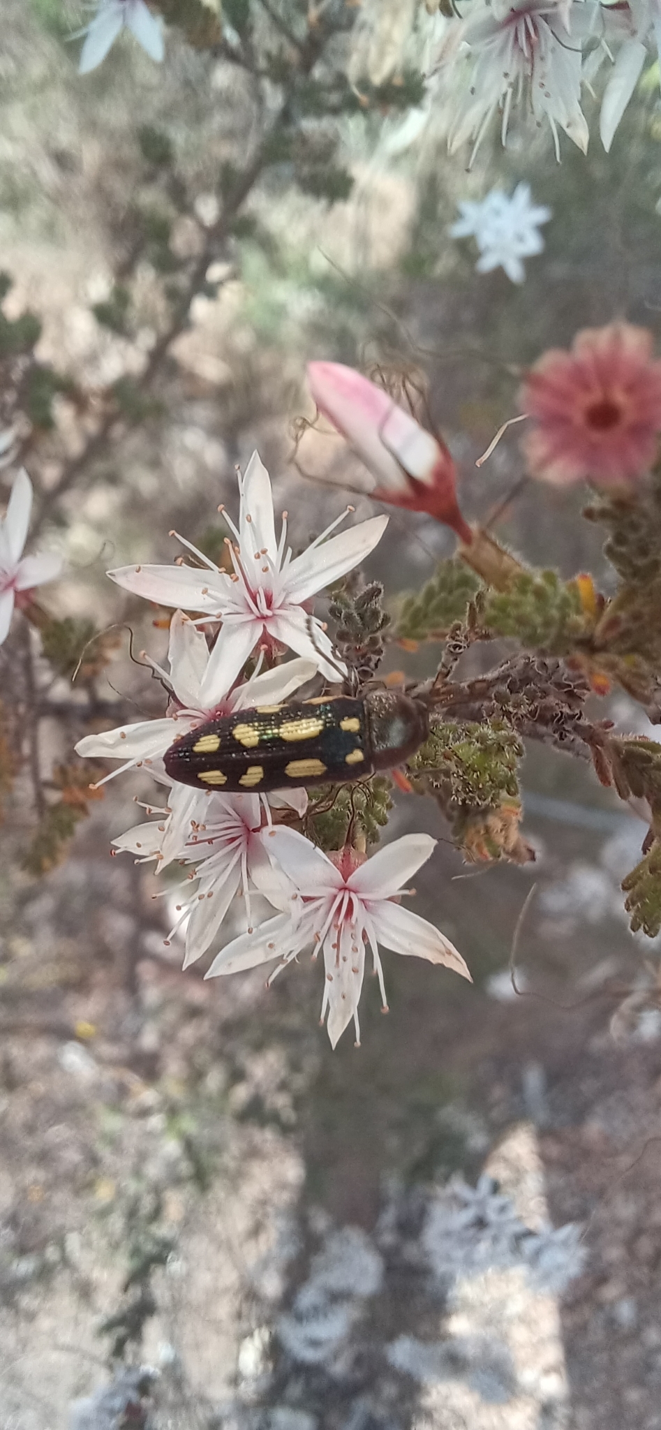 Castiarina parallelipennis | species | Calytrix tetragona | species | interactsWith | Animalia | Arthropoda | Insecta | Coleoptera | Buprestidae | Castiarina | Plantae | Tracheophyta | Magnoliopsida | Myrtales | Myrtaceae | Calytrix | -34.68001 | 138.832305 | 2024 | 10 | 11 | http://creativecommons.org/licenses/by-nc/4.0/ | https://www.inaturalist.org/observations/246739850 | |