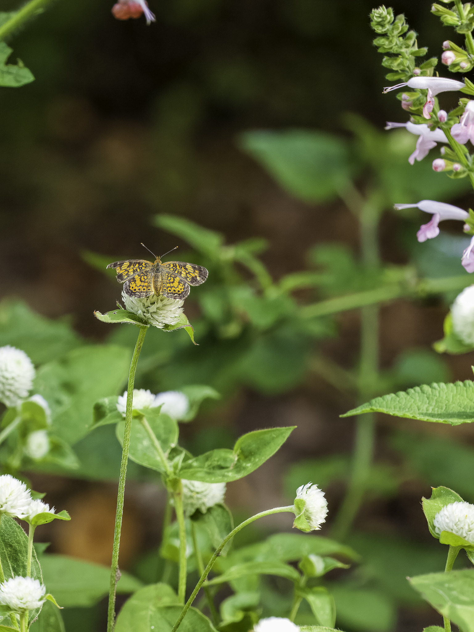 Phyciodes tharos | species | Gomphrena globosa | species | visitsFlowersOf | Animalia | Arthropoda | Insecta | Lepidoptera | Nymphalidae | Phyciodes | Plantae | Tracheophyta | Magnoliopsida | Caryophyllales | Amaranthaceae | Gomphrena | 43.731698 | -71.591137 | 2024 | 8 | 2 | http://creativecommons.org/licenses/by-nc/4.0/ | https://www.inaturalist.org/observations/246705028 | |