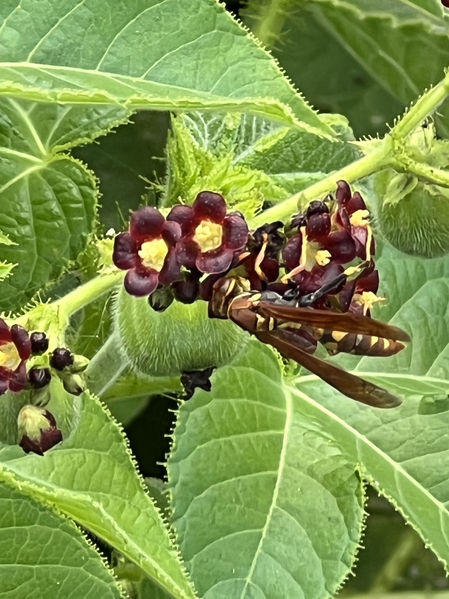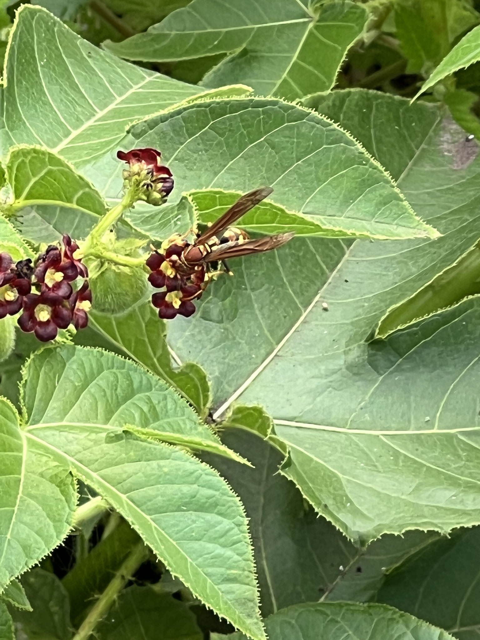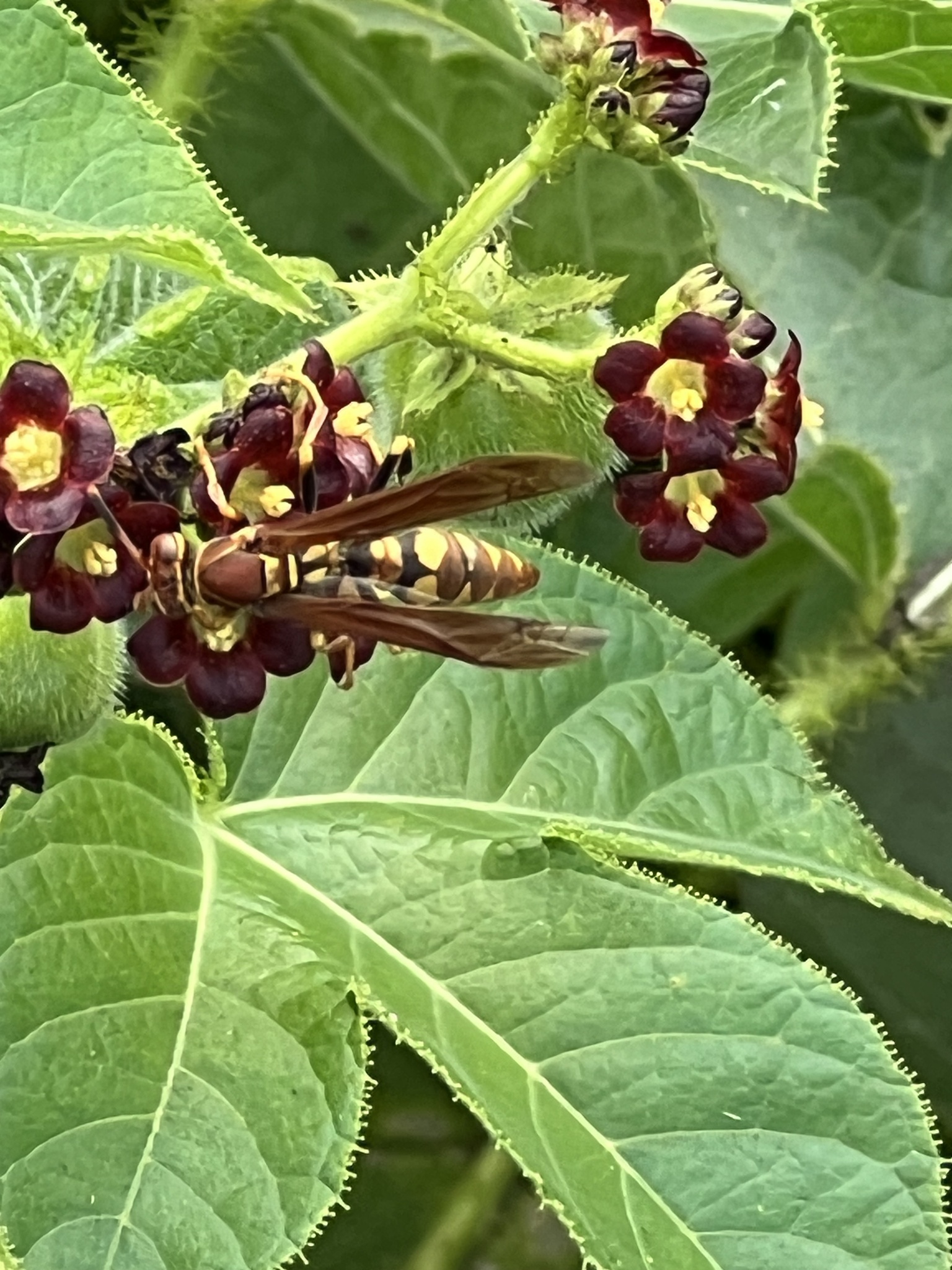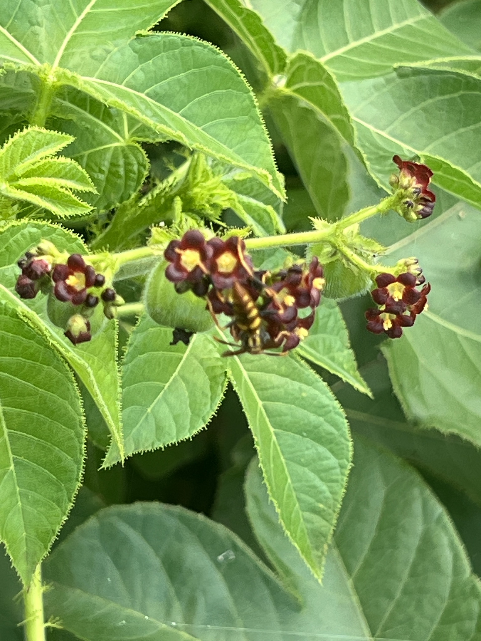 Polistes versicolor | species | Jatropha gossypiifolia | species | visitsFlowersOf | Animalia | Arthropoda | Insecta | Hymenoptera | Eumenidae | Polistes | Plantae | Tracheophyta | Magnoliopsida | Malpighiales | Euphorbiaceae | Jatropha | -0.736628 | -90.317663 | 2023 | 5 | 29 | http://creativecommons.org/licenses/by-nc/4.0/ | https://www.inaturalist.org/observations/164619230 | |
