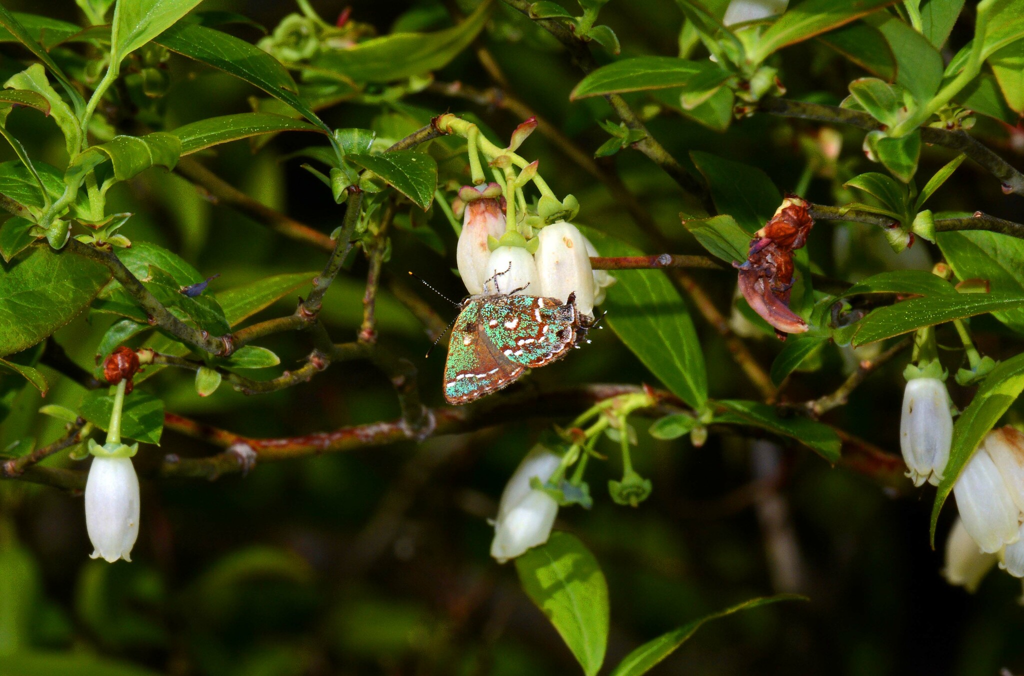 Mitoura hesseli | species | Vaccinium corymbosum | species | visitsFlowersOf | Animalia | Arthropoda | Insecta | Lepidoptera | Lycaenidae | Mitoura | Plantae | Tracheophyta | Magnoliopsida | Ericales | Ericaceae | Vaccinium | 39.683762 | -74.360511 | 2014 | 5 | 17 | http://creativecommons.org/licenses/by-nc/4.0/ | https://www.inaturalist.org/observations/246495859 | |