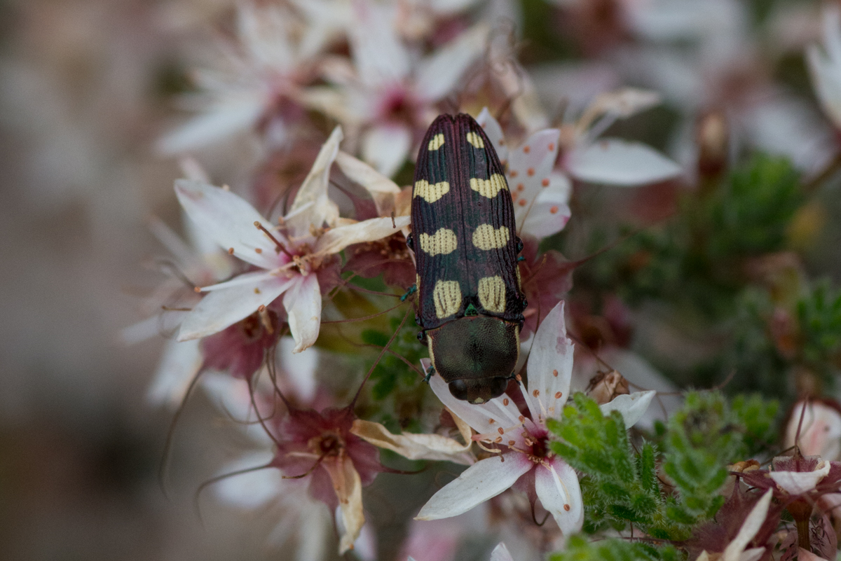 Castiarina decemmaculata | species | Calytrix tetragona | species | interactsWith | Animalia | Arthropoda | Insecta | Coleoptera | Buprestidae | Castiarina | Plantae | Tracheophyta | Magnoliopsida | Myrtales | Myrtaceae | Calytrix | -34.692015 | 138.826933 | 2024 | 10 | 7 | http://creativecommons.org/licenses/by-nc/4.0/ | https://www.inaturalist.org/observations/246283383 | |