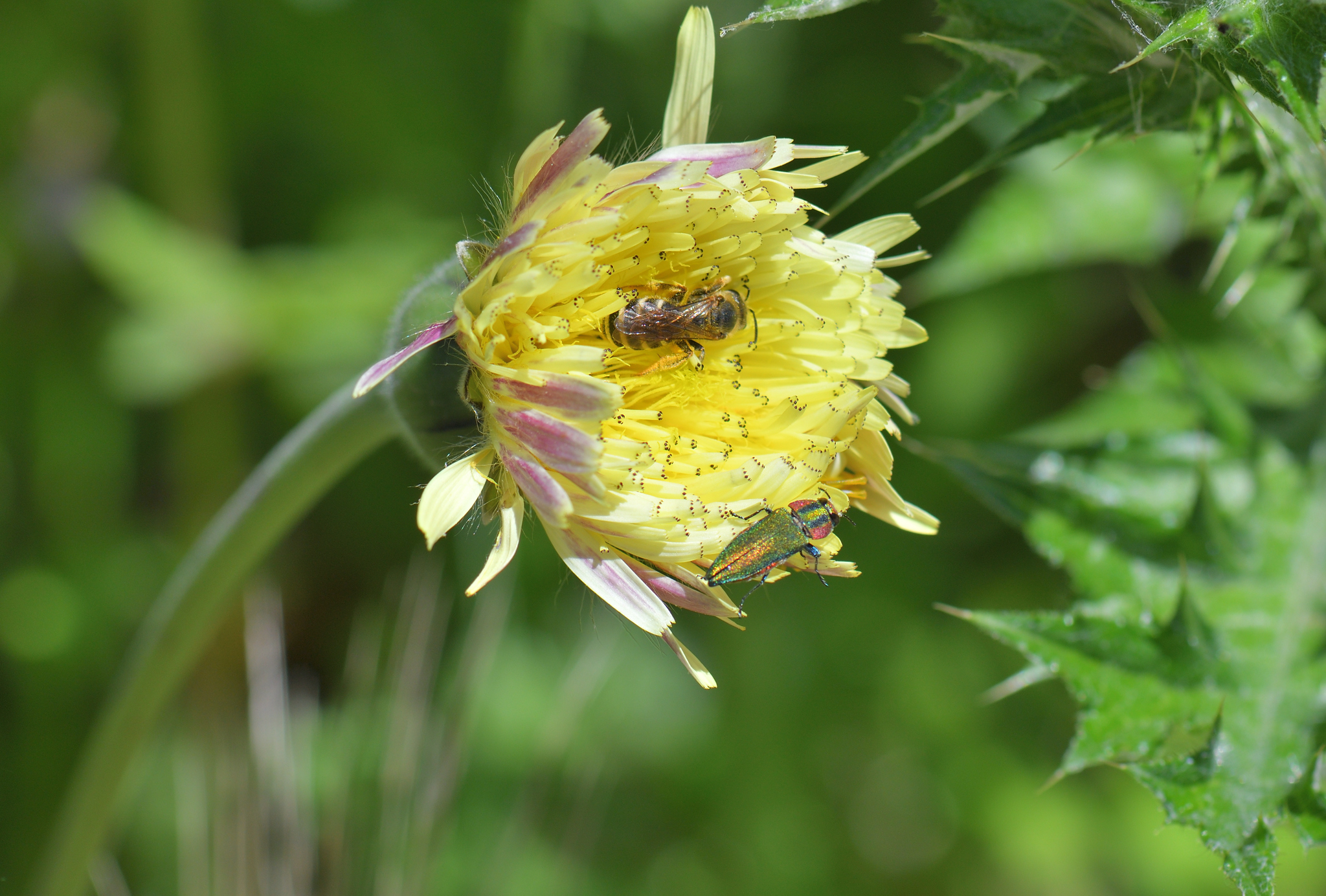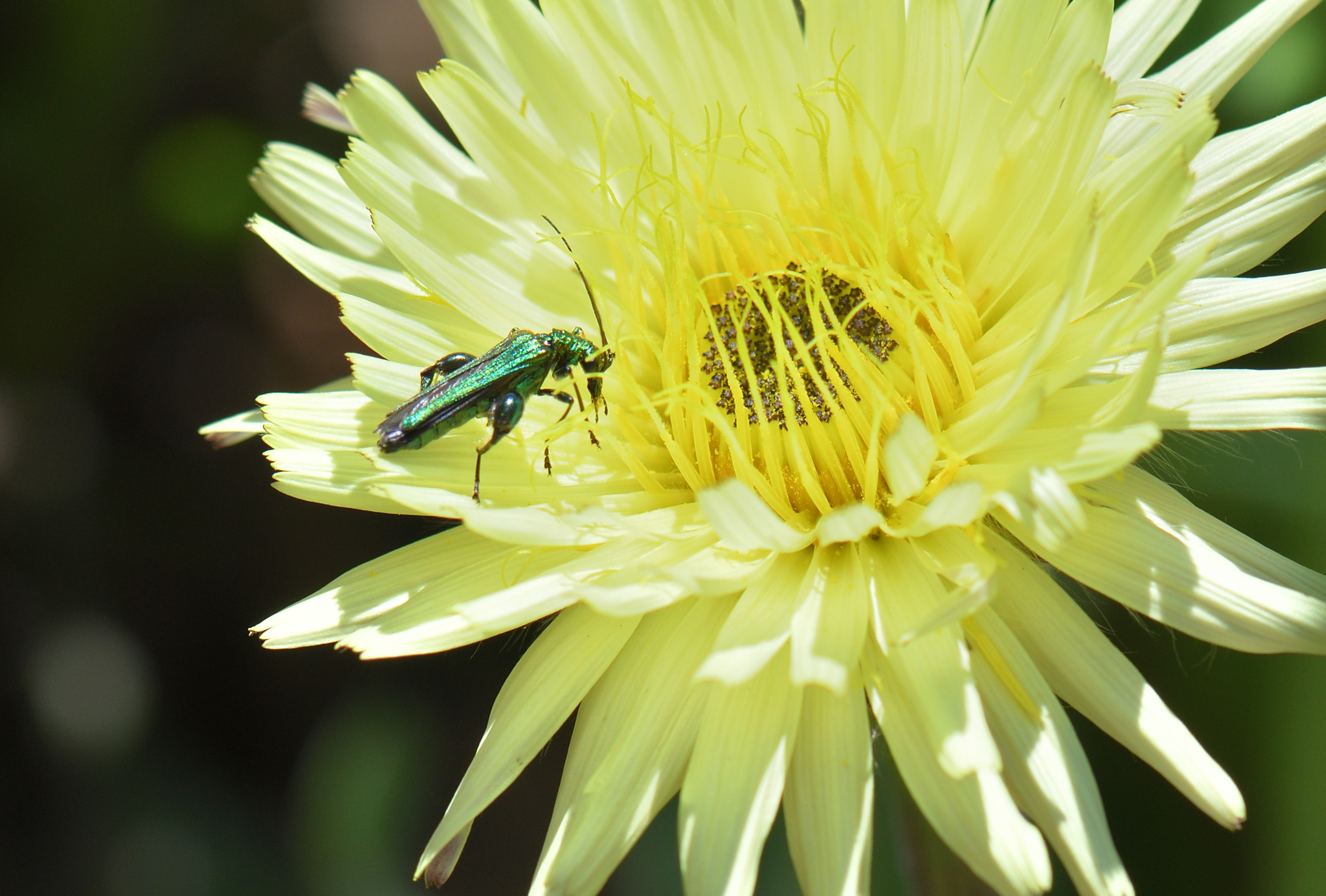 Oedemera nobilis | species | Urospermum dalechampii | species | visitsFlowersOf | Animalia | Arthropoda | Insecta | Coleoptera | Oedemeridae | Oedemera | Plantae | Tracheophyta | Magnoliopsida | Asterales | Asteraceae | Urospermum | 43.194143 | 6.009258 | 2021 | 5 | 8 | http://creativecommons.org/licenses/by-nc/4.0/ | https://www.inaturalist.org/observations/77901733 | |
