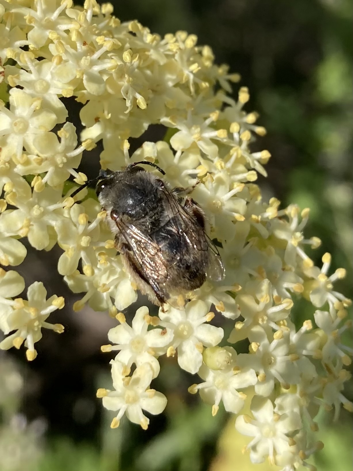 Habropoda depressa | species | Sambucus | genus | eats | Animalia | Arthropoda | Insecta | Hymenoptera | Apidae | Habropoda | Plantae | Tracheophyta | Magnoliopsida | Dipsacales | Viburnaceae | Sambucus | 37.91323 | -122.149742 | 2021 | 5 | 7 | http://creativecommons.org/licenses/by-nc/4.0/ | https://www.inaturalist.org/observations/77796177 | |