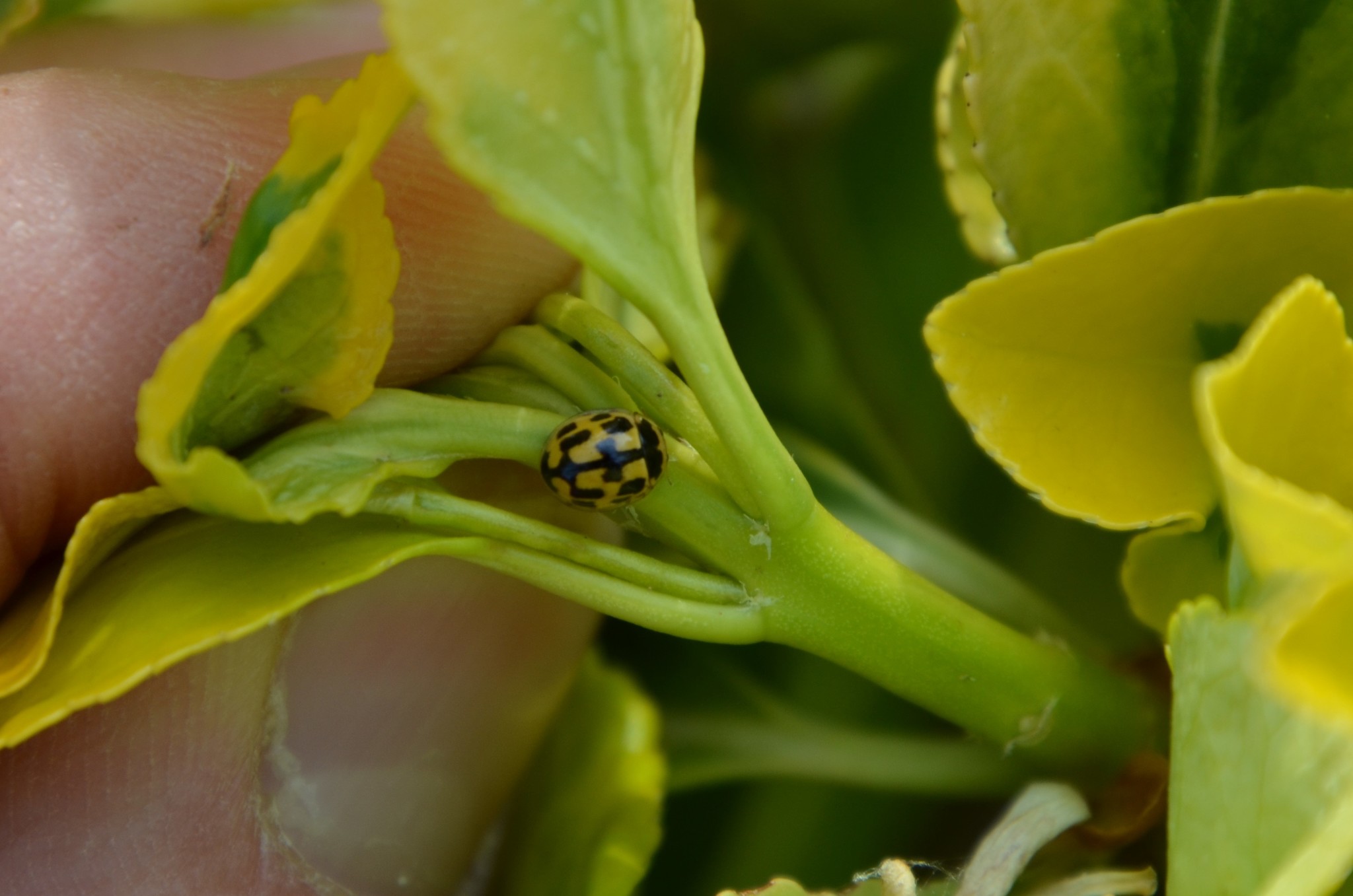 Propylaea quatuordecimpunctata | species | Euonymus japonicus | species | interactsWith | Animalia | Arthropoda | Insecta | Coleoptera | Coccinellidae | Propylaea | Plantae | Tracheophyta | Magnoliopsida | Celastrales | Celastraceae | Euonymus | 50.630054 | 4.783231 | 2021 | 5 | 3 | http://creativecommons.org/licenses/by-nc/4.0/ | https://www.inaturalist.org/observations/77360690 | |