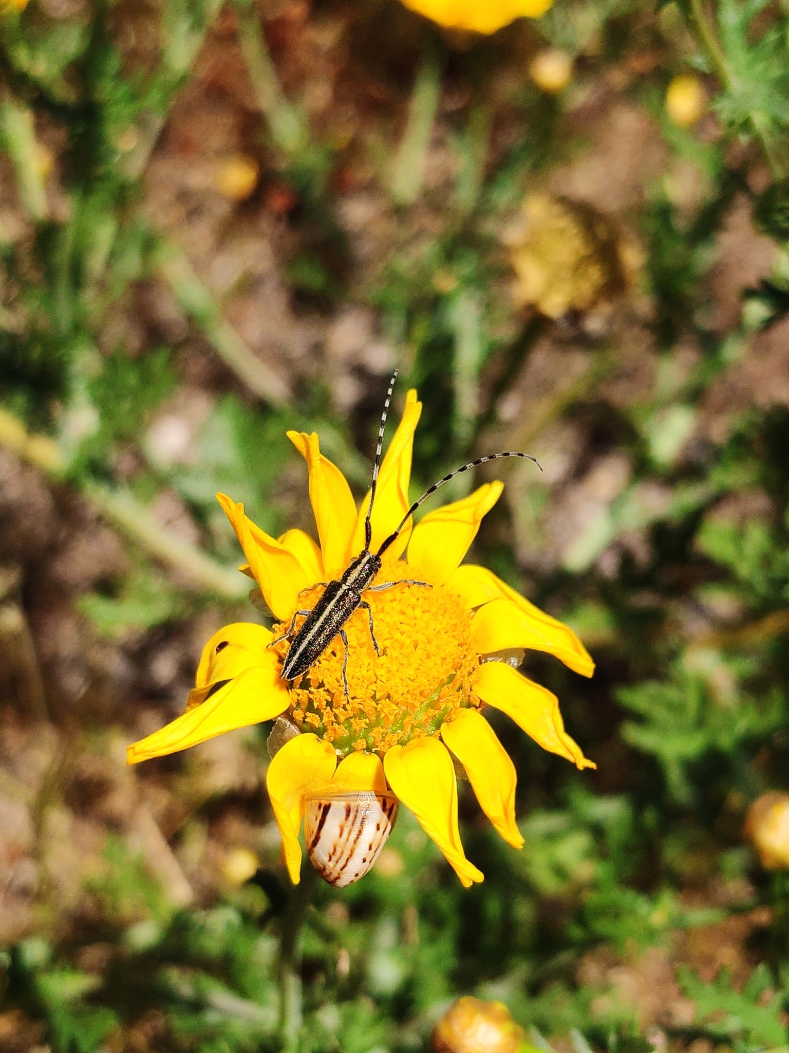 Agapanthia suturalis | species | Glebionis coronaria | species | visitsFlowersOf | Animalia | Arthropoda | Insecta | Coleoptera | Cerambycidae | Agapanthia | Plantae | Tracheophyta | Magnoliopsida | Asterales | Asteraceae | Glebionis | 34.587431 | 32.975588 | 2021 | 4 | 22 | http://creativecommons.org/licenses/by-nc/4.0/ | https://www.inaturalist.org/observations/75026851 | |