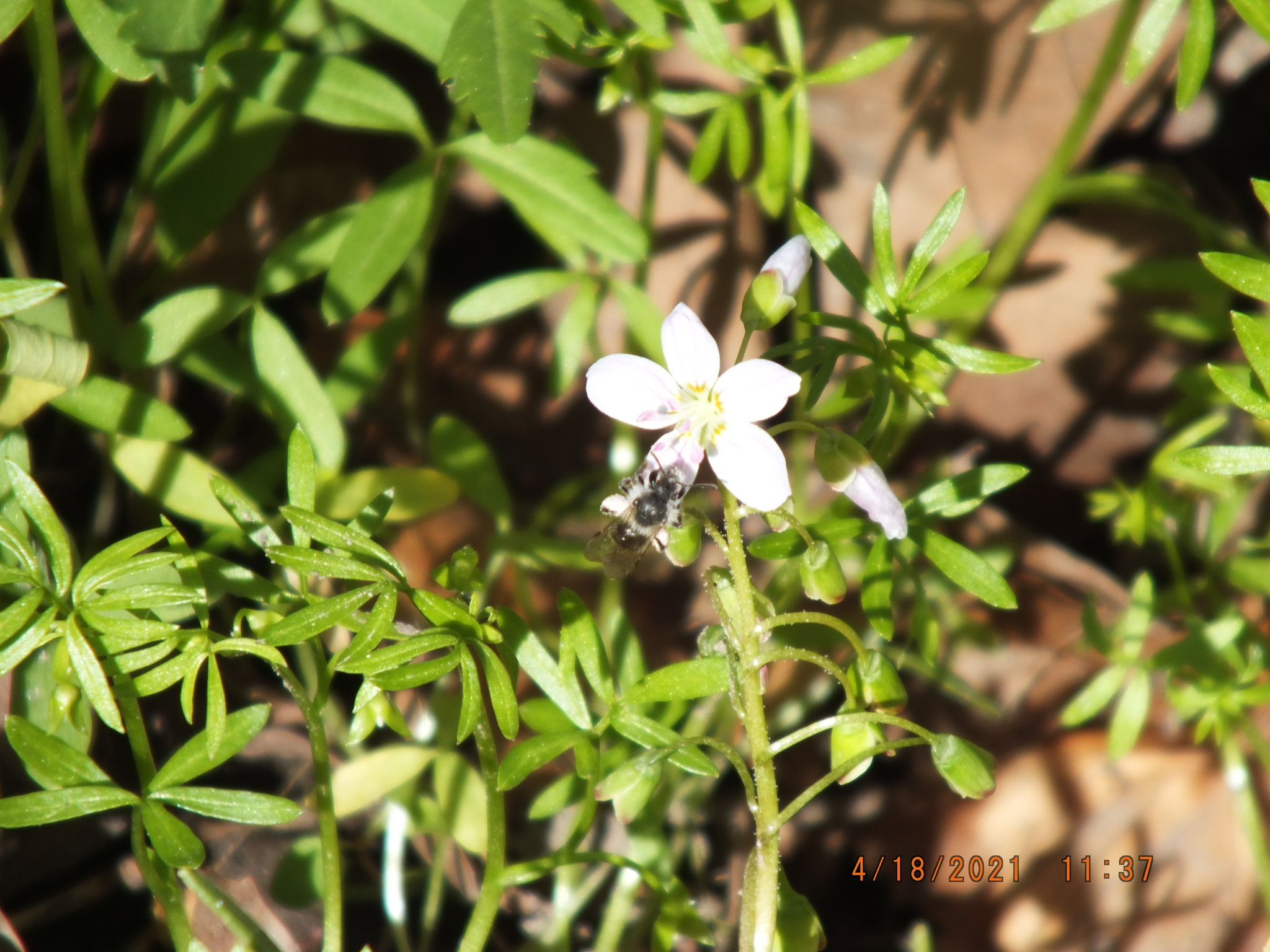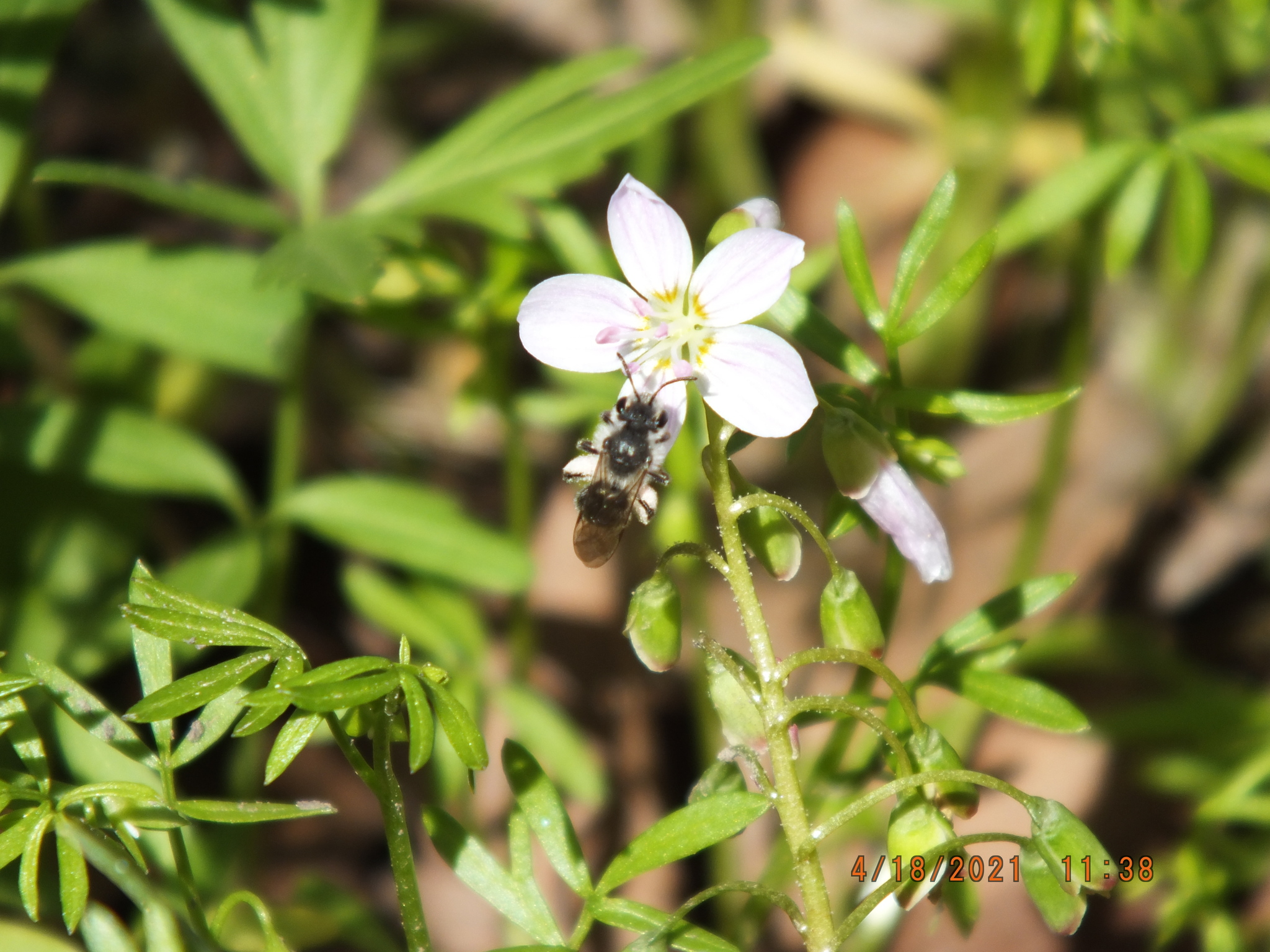 Andrena erigeniae | species | Claytonia virginica | species | visitsFlowersOf | Animalia | Arthropoda | Insecta | Hymenoptera | Andrenidae | Andrena | Plantae | Tracheophyta | Magnoliopsida | Caryophyllales | Montiaceae | Claytonia | 39.875623 | -86.295411 | 2021 | 4 | 18 | http://creativecommons.org/licenses/by-nc/4.0/ | https://www.inaturalist.org/observations/74434124 | |