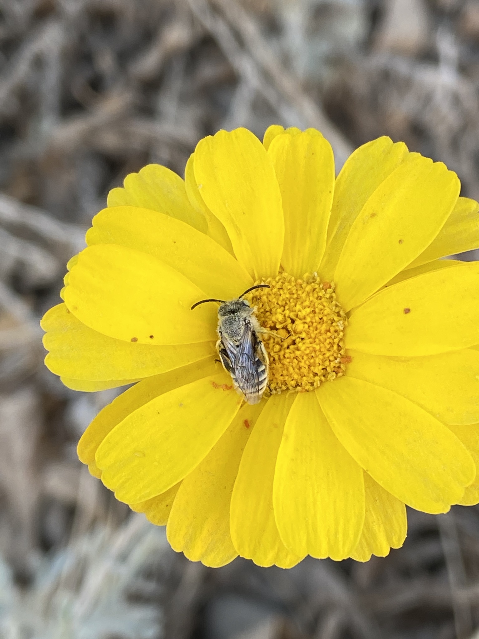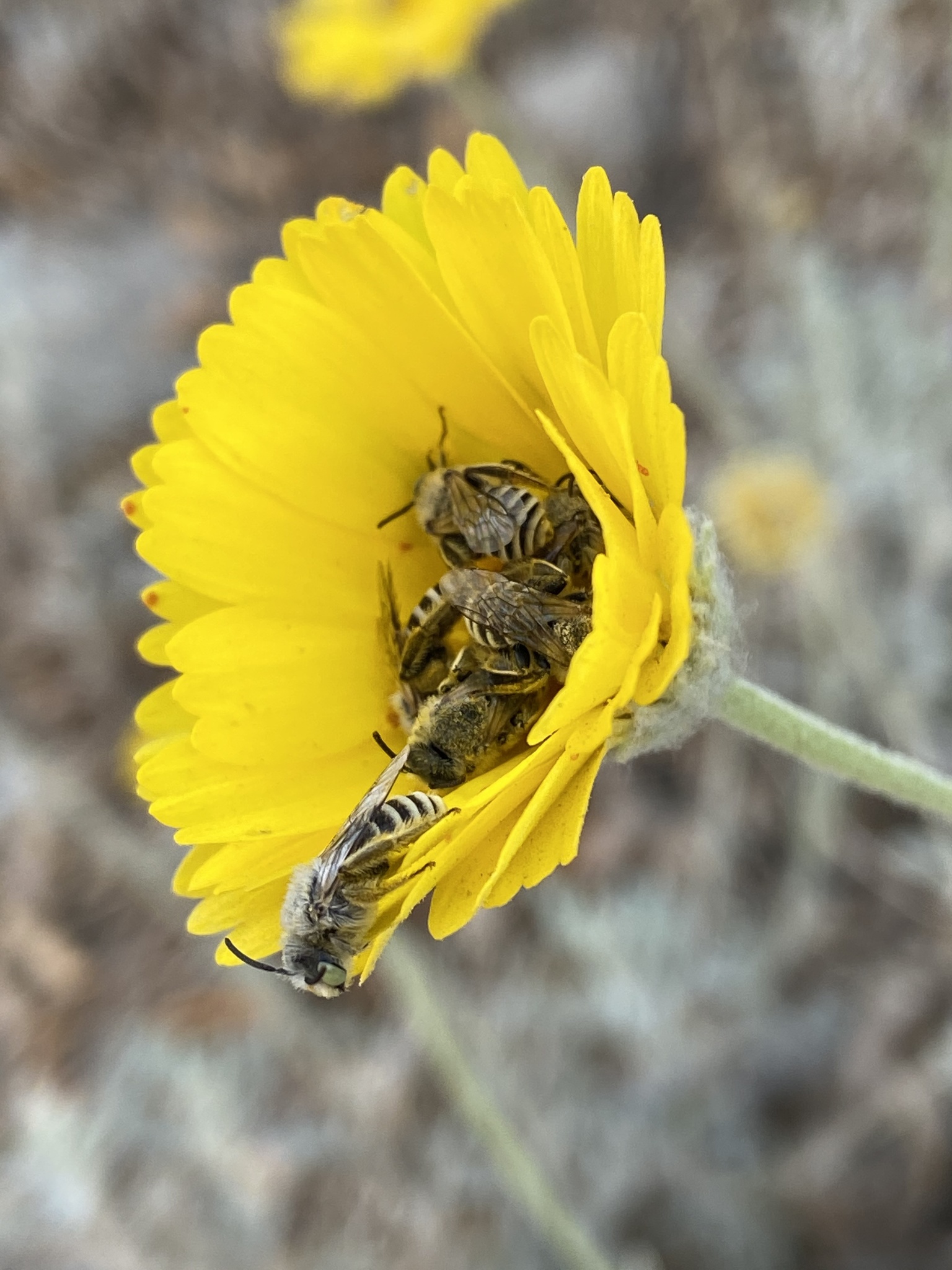 Hesperapis | genus | Baileya multiradiata | species | visitsFlowersOf | Animalia | Arthropoda | Insecta | Hymenoptera | Melittidae | Hesperapis | Plantae | Tracheophyta | Magnoliopsida | Asterales | Asteraceae | Baileya | 33.698075 | -116.375437 | 2021 | 4 | 16 | http://creativecommons.org/licenses/by-nc/4.0/ | https://www.inaturalist.org/observations/74139837 | |