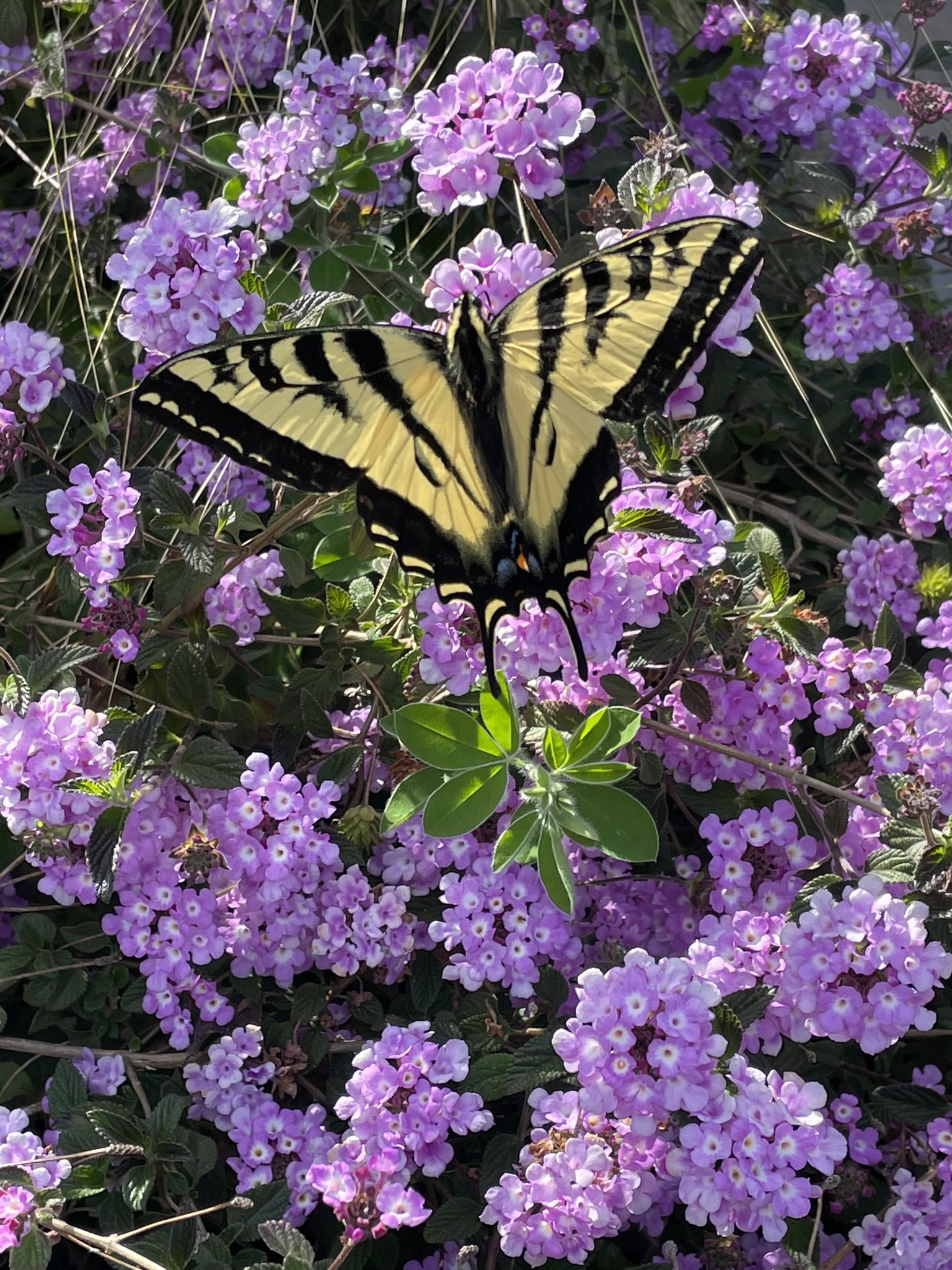 Papilio rutulus | species | Lantana montevidensis | species | eats | Animalia | Arthropoda | Insecta | Lepidoptera | Papilionidae | Papilio | Plantae | Tracheophyta | Magnoliopsida | Lamiales | Verbenaceae | Lantana | 37.934092 | -122.535254 | 2021 | 4 | 8 | http://creativecommons.org/licenses/by-nc/4.0/ | https://www.inaturalist.org/observations/73385707 | |