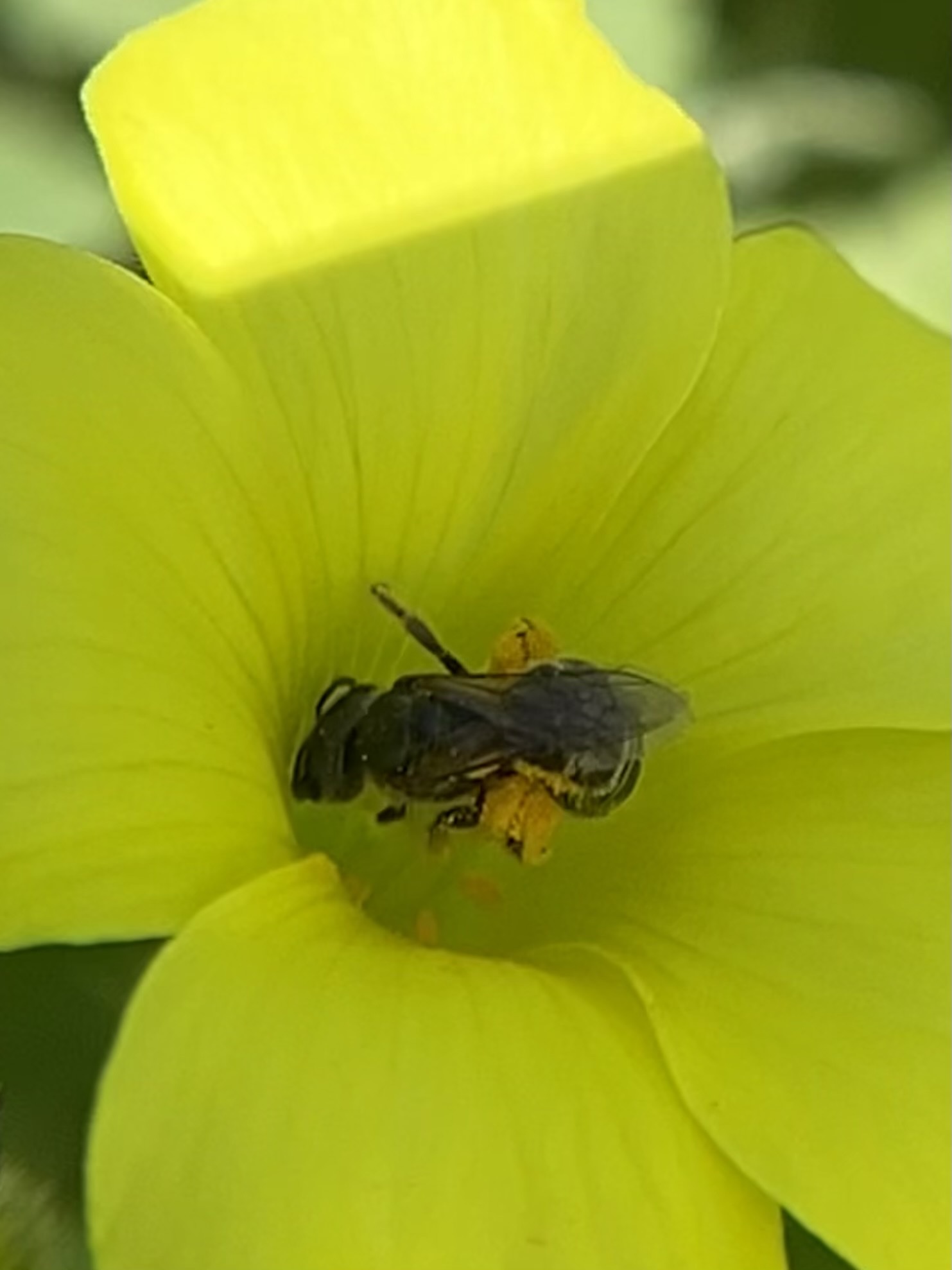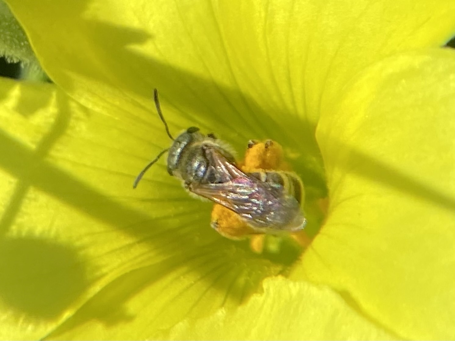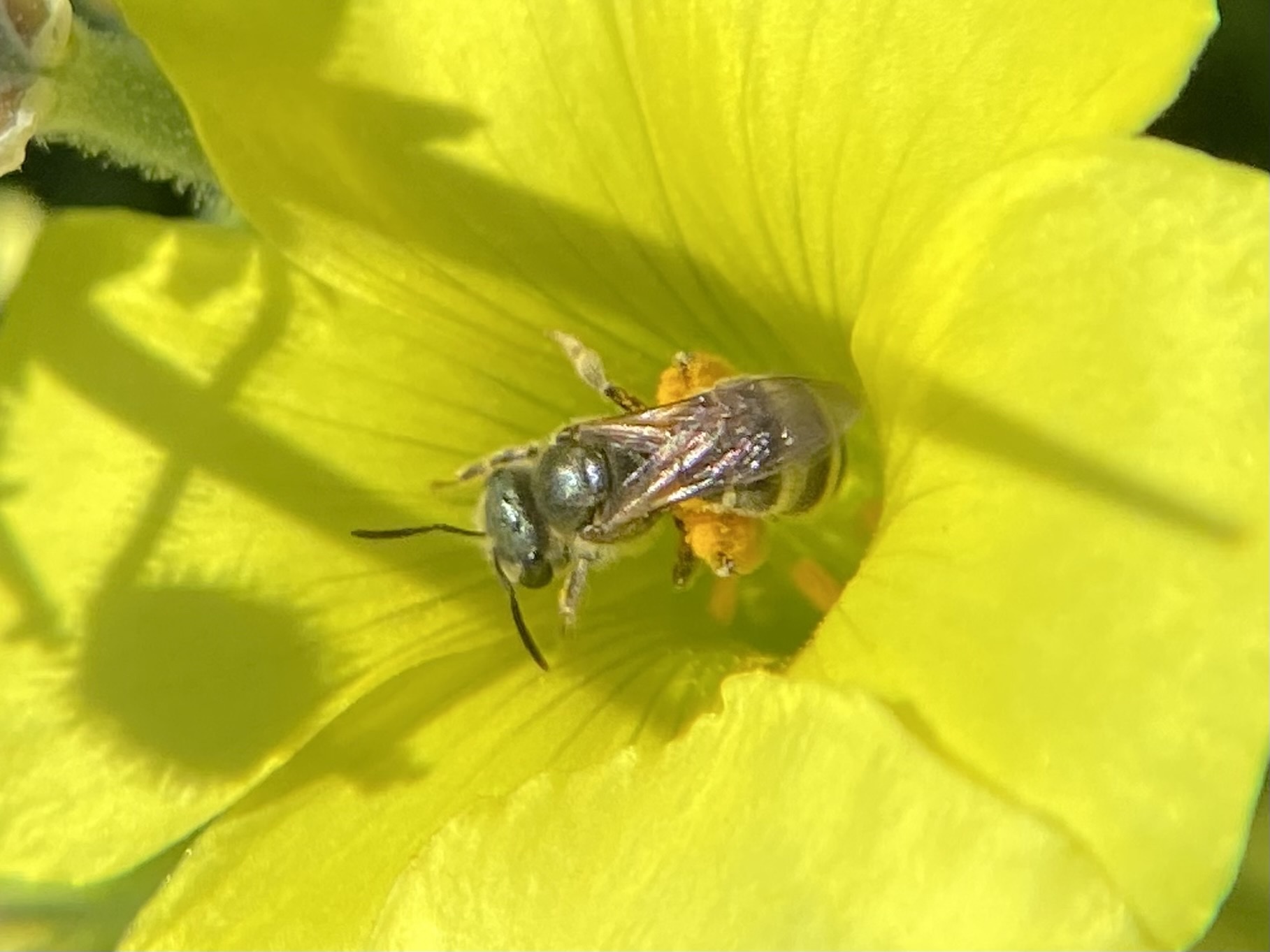 Halictus tripartitus | species | Oxalis | genus | eats | Animalia | Arthropoda | Insecta | Hymenoptera | Halictidae | Halictus | Plantae | Tracheophyta | Magnoliopsida | Oxalidales | Oxalidaceae | Oxalis | 37.440338 | -121.90965 | 2021 | 4 | 6 | http://creativecommons.org/licenses/by-nc/4.0/ | https://www.inaturalist.org/observations/73136853 | |
