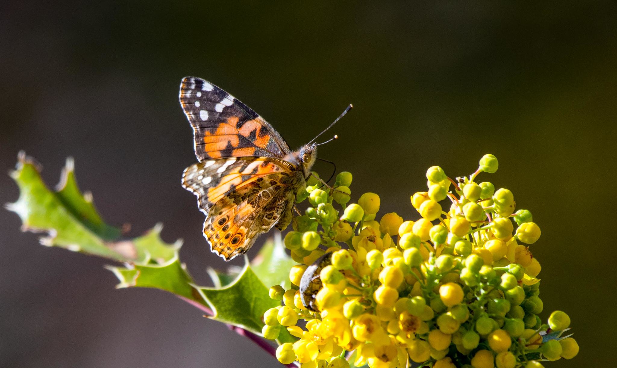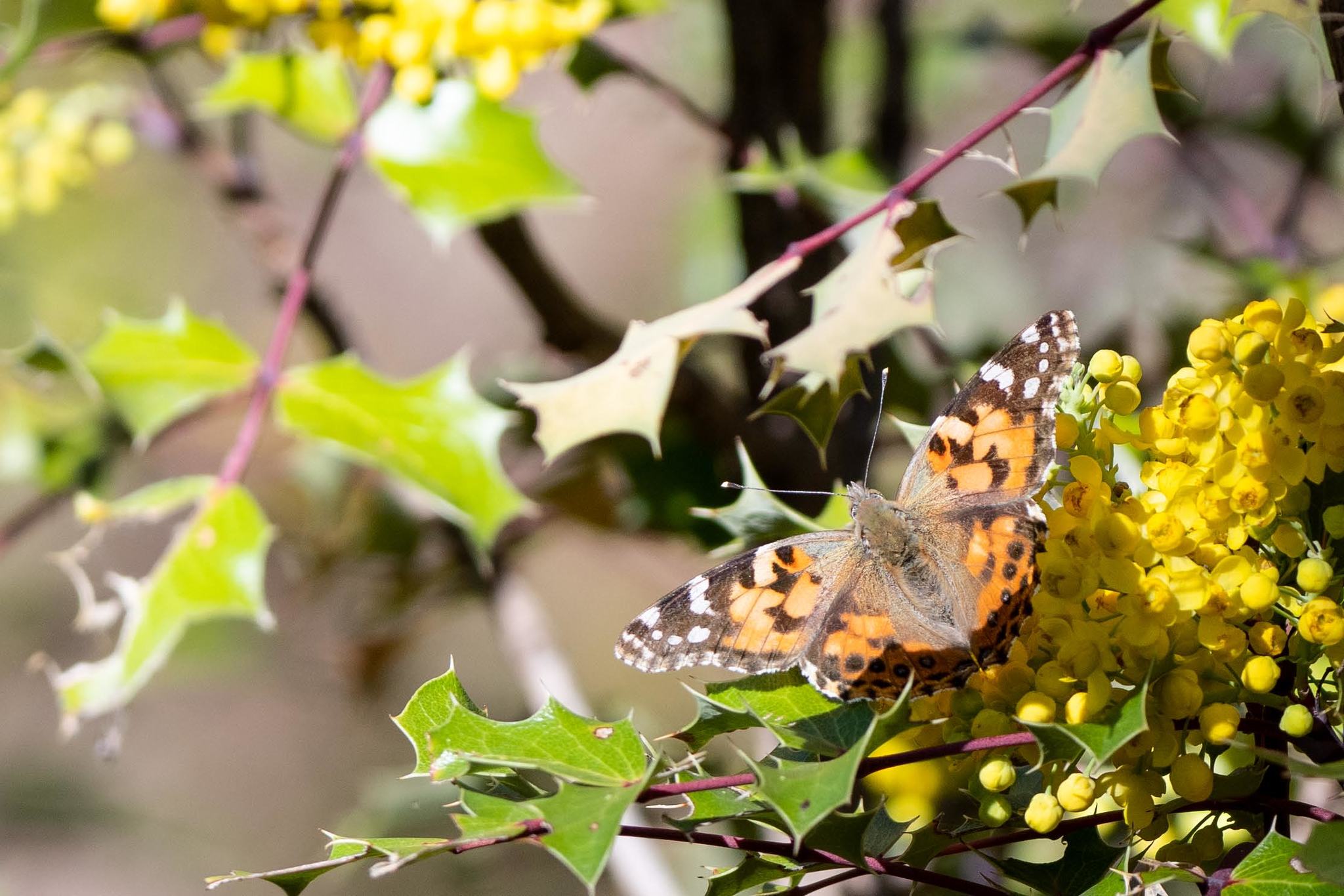 Vanessa cardui | species | Mahonia wilcoxii | species | visitsFlowersOf | Animalia | Arthropoda | Insecta | Lepidoptera | Nymphalidae | Vanessa | Plantae | Tracheophyta | Magnoliopsida | Ranunculales | Berberidaceae | Mahonia | 31.447747 | -110.307297 | 2021 | 4 | 4 | http://creativecommons.org/licenses/by-nc/4.0/ | https://www.inaturalist.org/observations/72981391 | |