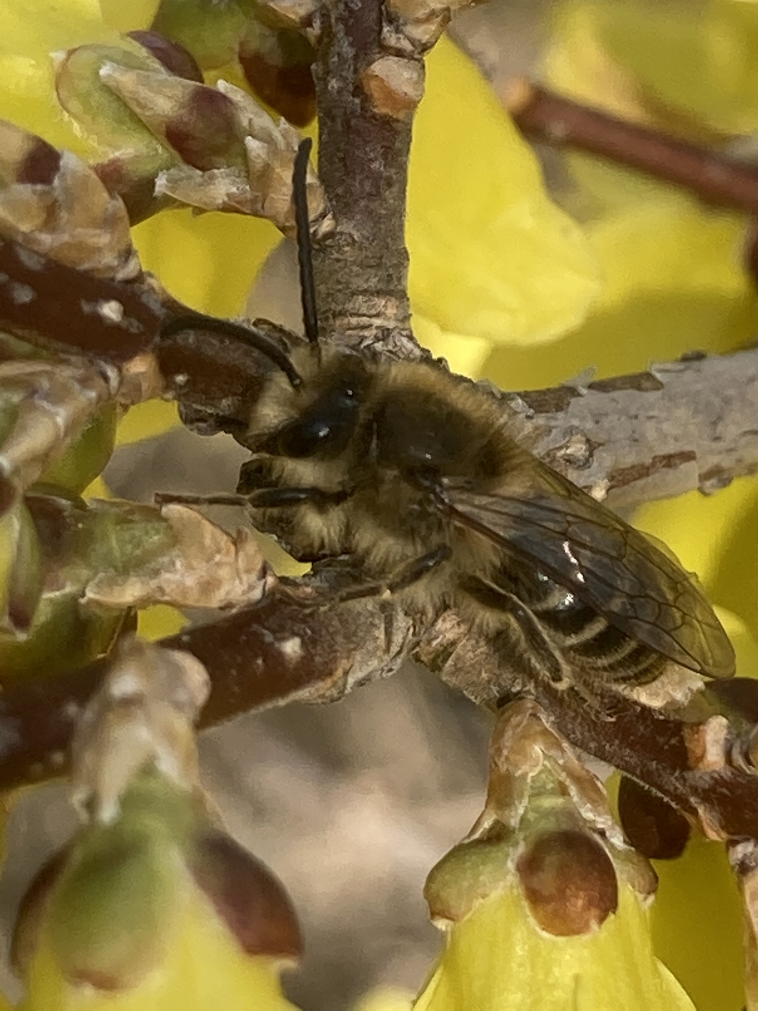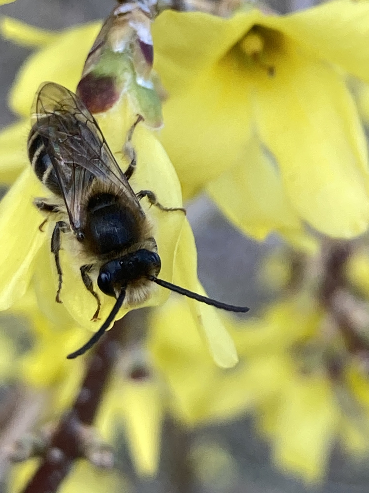 Colletes inaequalis | species | Forsythia | genus | visitsFlowersOf | Animalia | Arthropoda | Insecta | Hymenoptera | Colletidae | Colletes | Plantae | Tracheophyta | Magnoliopsida | Lamiales | Oleaceae | Forsythia | 42.656879 | -73.704449 | 2021 | 4 | 4 | http://creativecommons.org/licenses/by/4.0/ | https://www.inaturalist.org/observations/72984445 | |