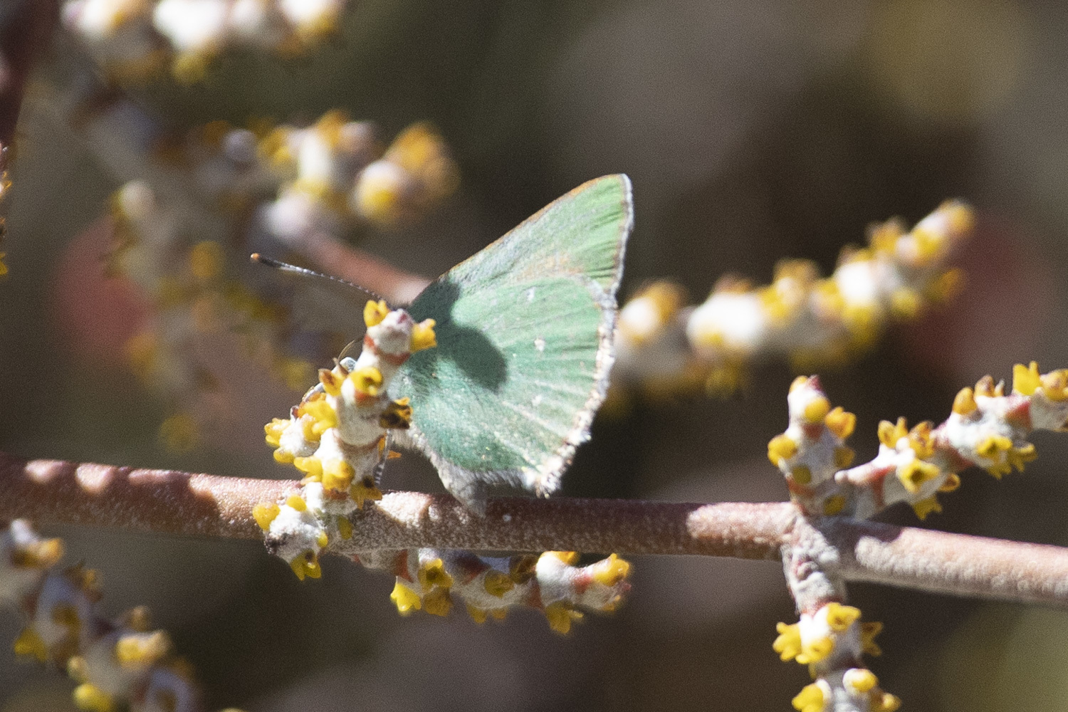 Callophrys dumetorum | species | Phoradendron californicum | species | visitsFlowersOf | Animalia | Arthropoda | Insecta | Lepidoptera | Lycaenidae | Callophrys | Plantae | Tracheophyta | Magnoliopsida | Santalales | Viscaceae | Phoradendron | 33.650542 | -116.491933 | 2021 | 4 | 2 | http://creativecommons.org/licenses/by-nc/4.0/ | https://www.inaturalist.org/observations/72850904 | |