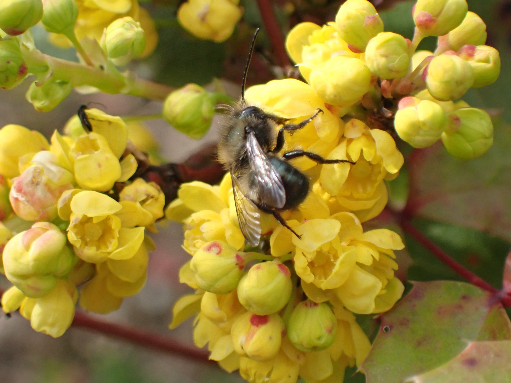 Osmia lignaria | species | Mahonia aquifolium | species | visits | Animalia | Arthropoda | Insecta | Hymenoptera | Megachilidae | Osmia | Plantae | Tracheophyta | Magnoliopsida | Ranunculales | Berberidaceae | Mahonia | 47.17961 | -122.247368 | 2021 | 4 | 3 | http://creativecommons.org/licenses/by/4.0/ | https://www.inaturalist.org/observations/72854099 | |