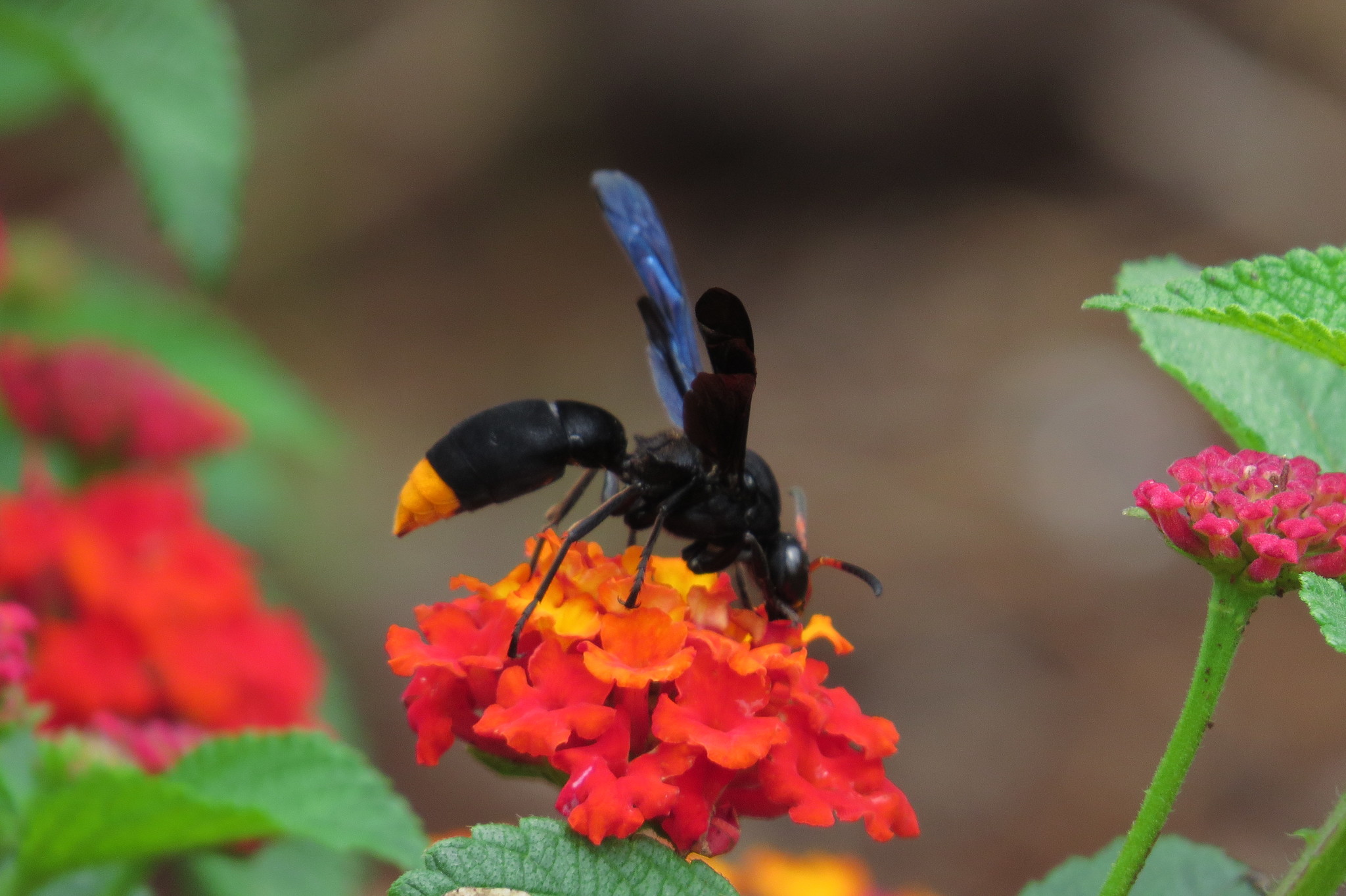 Synagris analis | species | Lantana camara | species | visits | Animalia | Arthropoda | Insecta | Hymenoptera | Vespidae | Synagris | Plantae | Tracheophyta | Magnoliopsida | Lamiales | Verbenaceae | Lantana | -1.221532 | 36.896541 | 2016 | 11 | 26 | http://creativecommons.org/licenses/by-nc/4.0/ | https://www.inaturalist.org/observations/72744078 | |