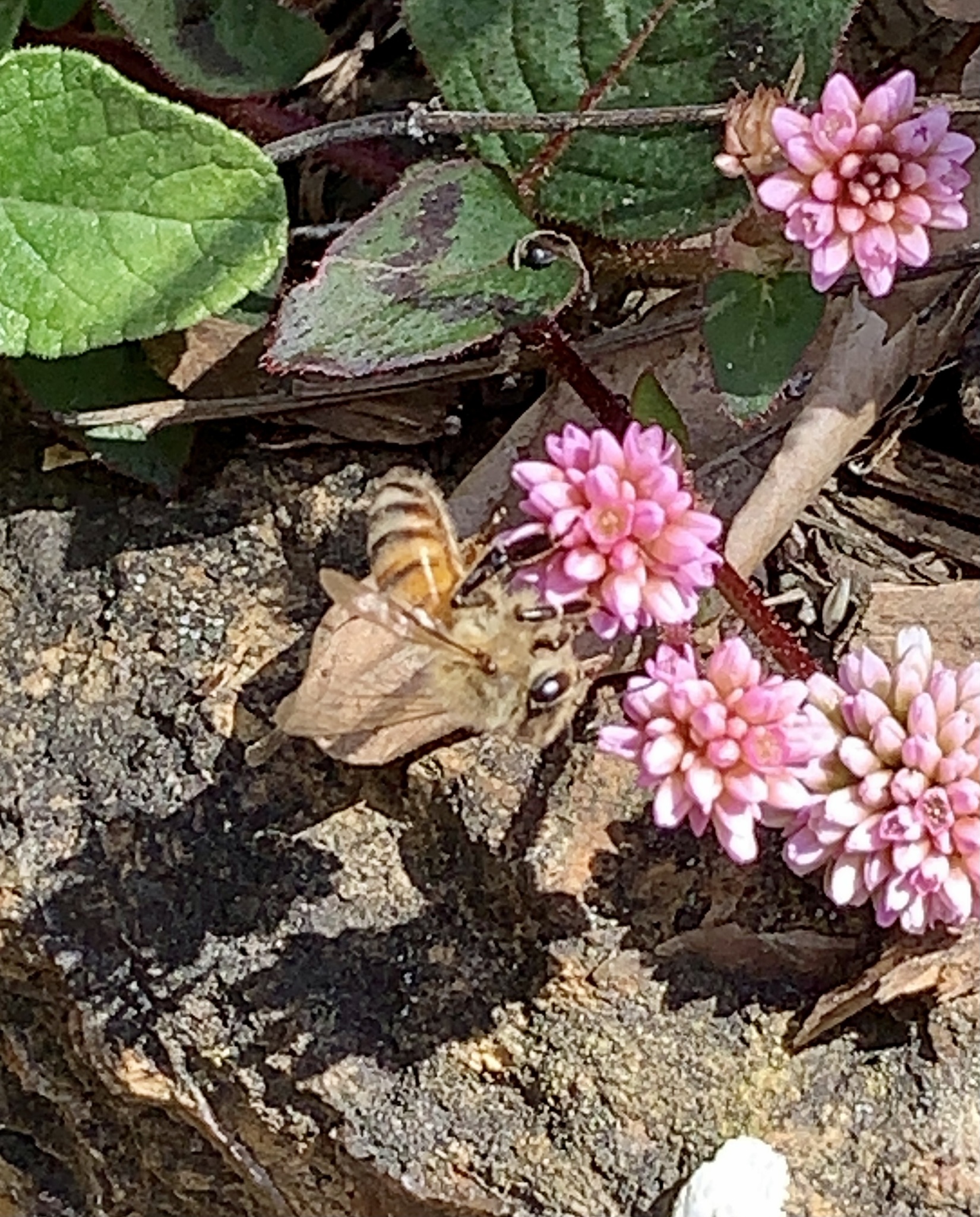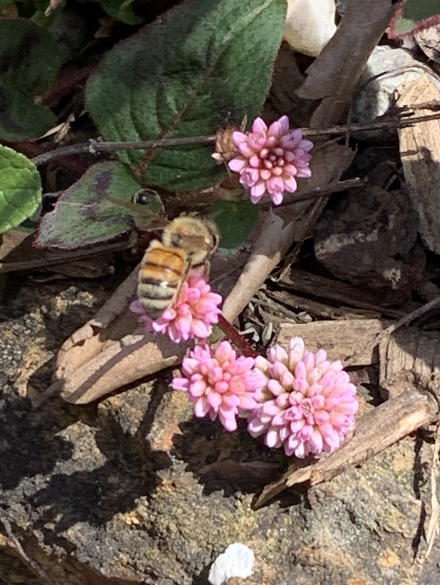 Apis mellifera | species | Persicaria capitata | species | eats | Animalia | Arthropoda | Insecta | Hymenoptera | Apidae | Apis | Plantae | Tracheophyta | Magnoliopsida | Caryophyllales | Polygonaceae | Persicaria | 37.909878 | -122.292617 | 2021 | 3 | 29 | http://creativecommons.org/licenses/by-nc/4.0/ | https://www.inaturalist.org/observations/72388425 | |