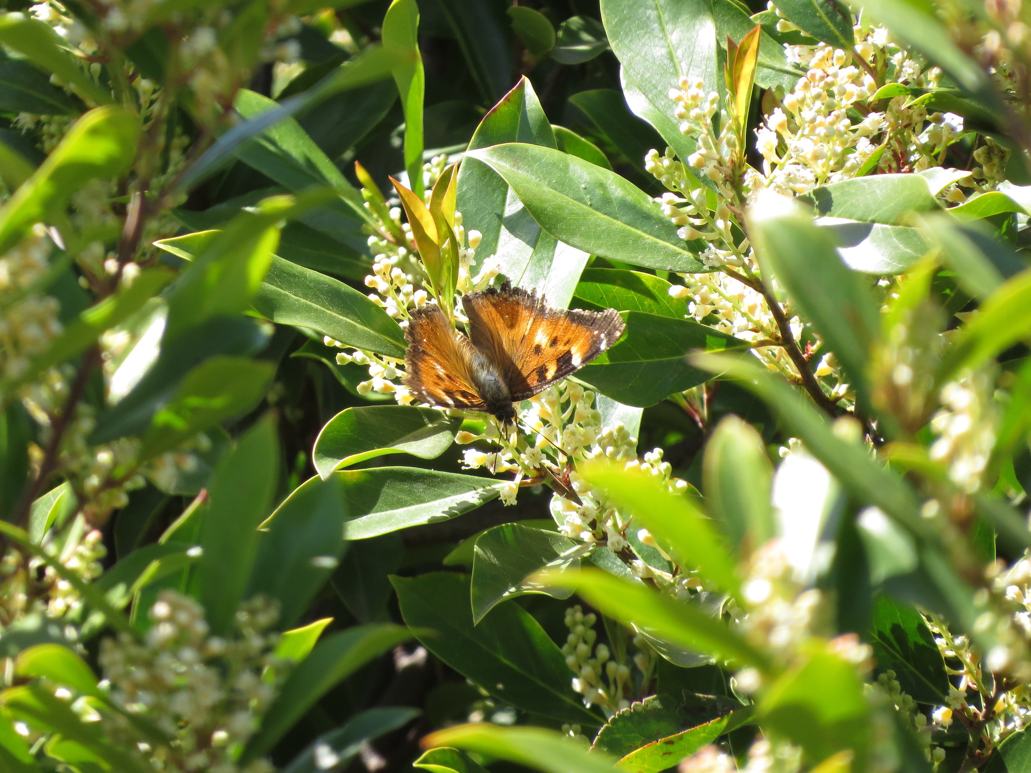 Nymphalis californica | species | Prunus caroliniana | species | eats | Animalia | Arthropoda | Insecta | Lepidoptera | Nymphalidae | Nymphalis | Plantae | Tracheophyta | Magnoliopsida | Rosales | Rosaceae | Prunus | 37.780893 | -121.729497 | 2021 | 3 | 28 | http://creativecommons.org/licenses/by-nc/4.0/ | https://www.inaturalist.org/observations/72313088 | |