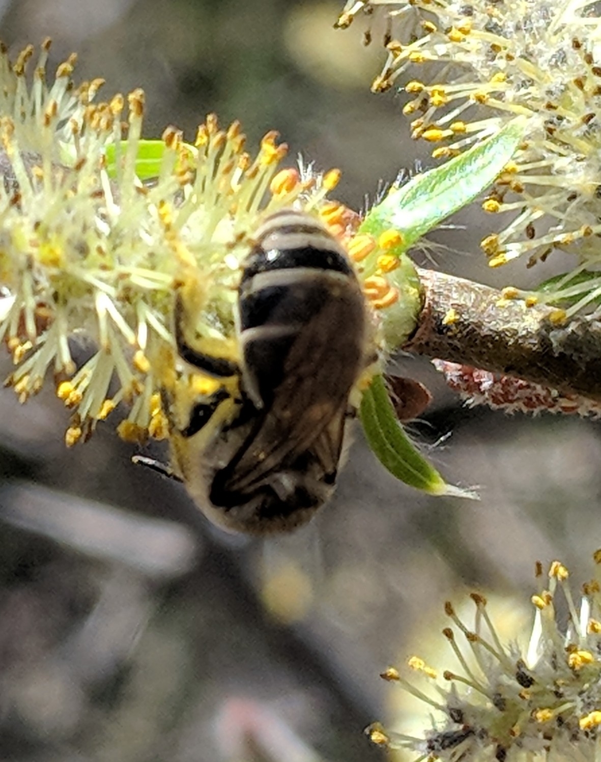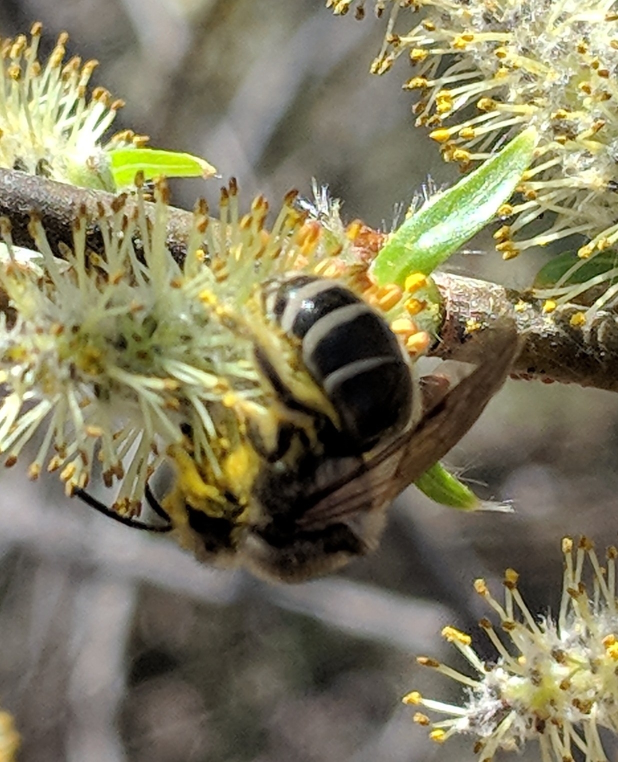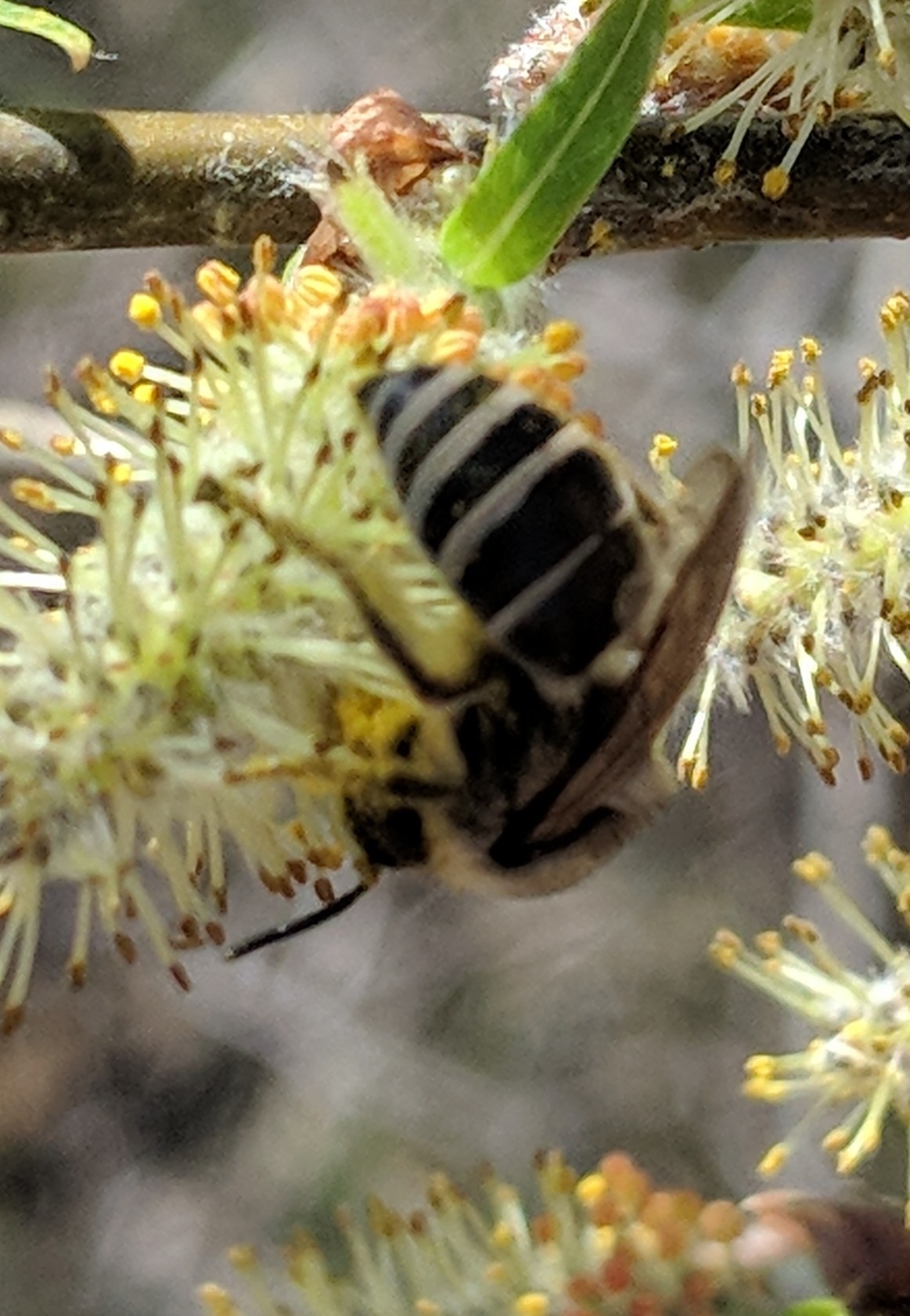Colletes inaequalis | species | Salix | genus | visitsFlowersOf | Animalia | Arthropoda | Insecta | Hymenoptera | Colletidae | Colletes | Plantae | Tracheophyta | Magnoliopsida | Malpighiales | Salicaceae | Salix | 39.206281 | -86.529534 | 2021 | 3 | 27 | http://creativecommons.org/licenses/by-nc/4.0/ | https://www.inaturalist.org/observations/72232071 | |