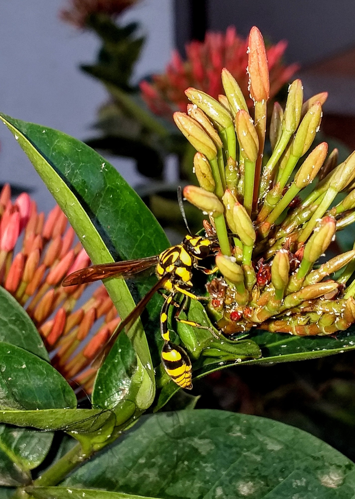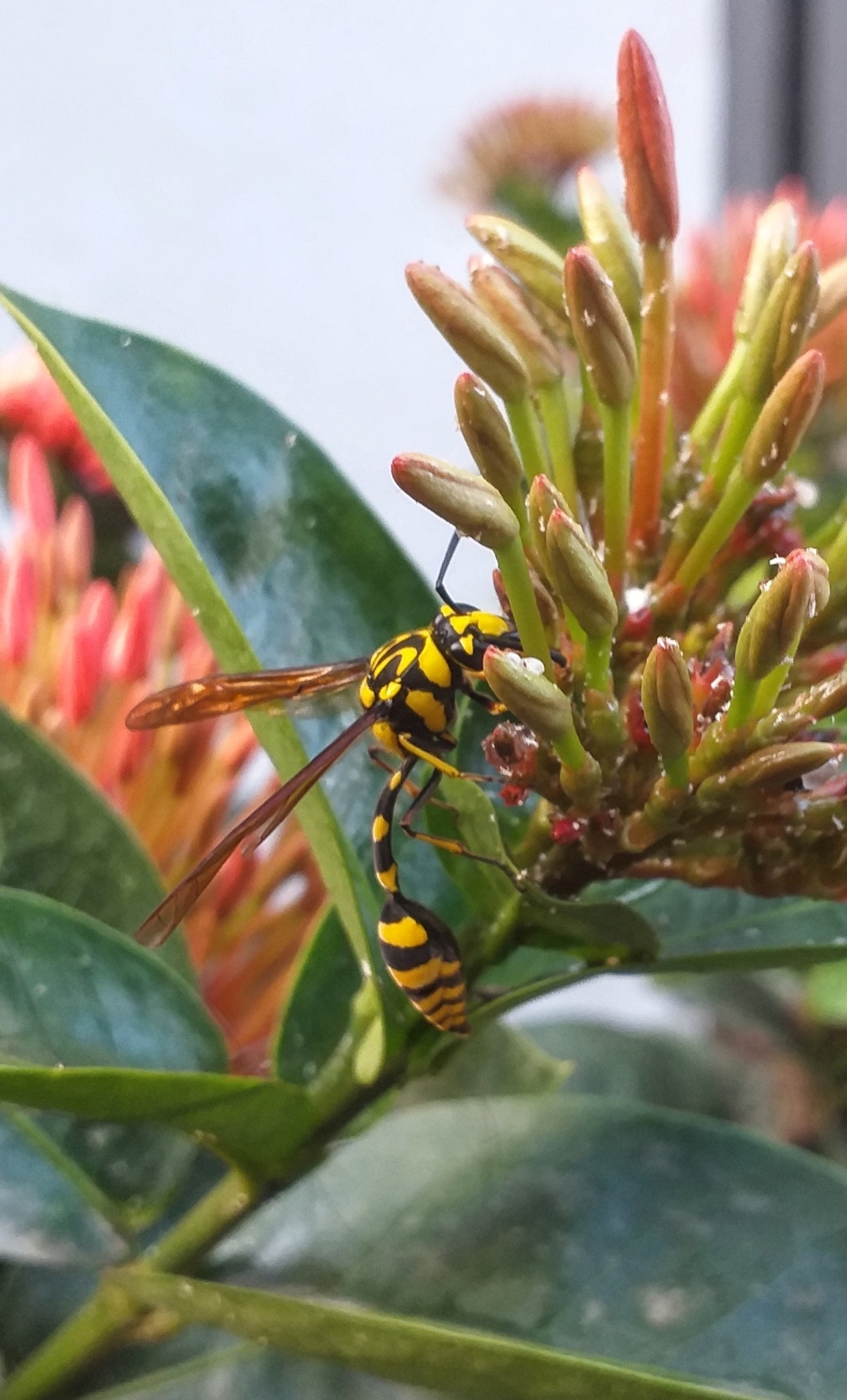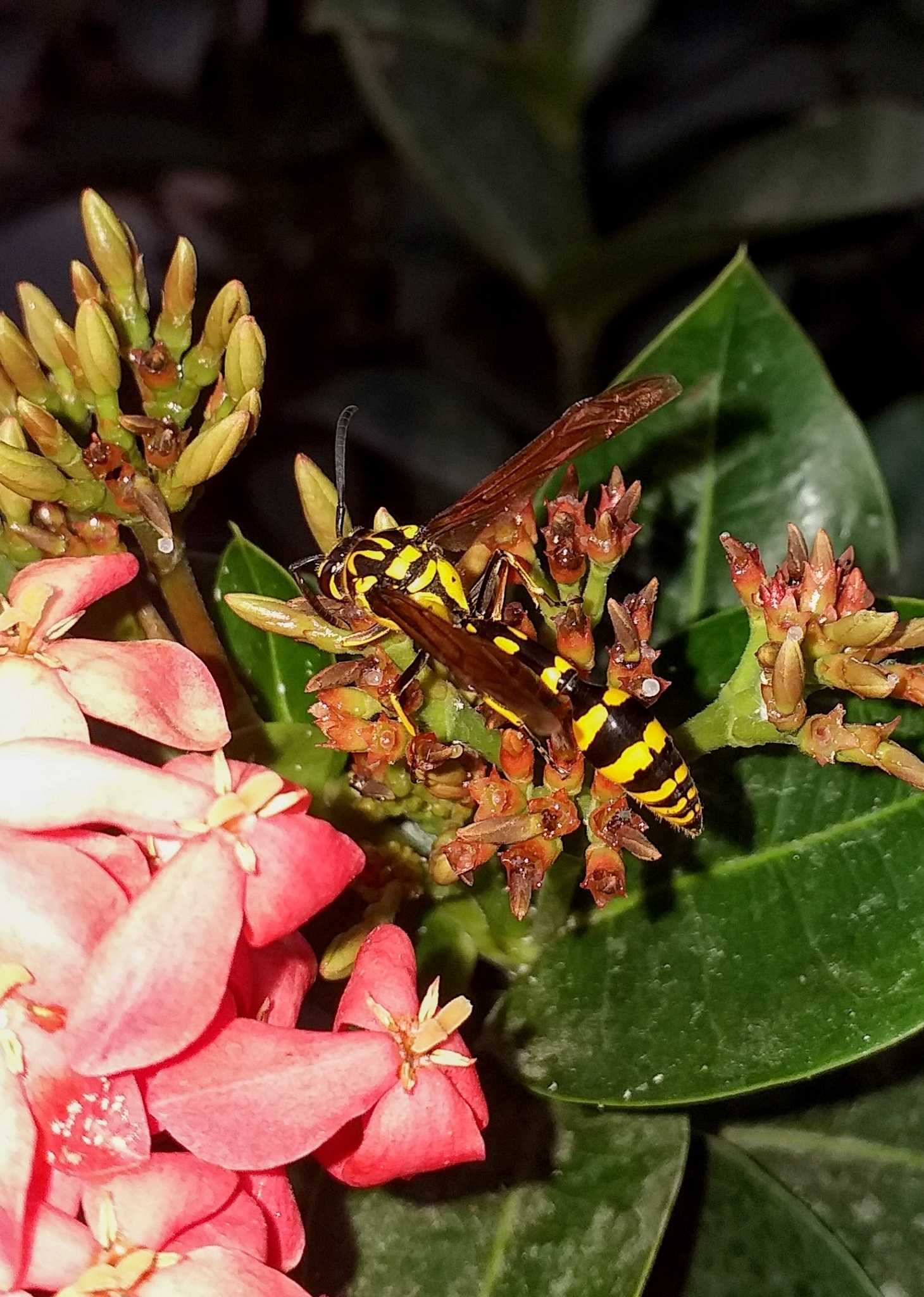 Phimenes flavopictus | species | Ixora | genus | visits | Animalia | Arthropoda | Insecta | Hymenoptera | Eumenidae | Phimenes | Plantae | Tracheophyta | Magnoliopsida | Gentianales | Rubiaceae | Ixora | 12.906602 | 77.67716 | 2021 | 3 | 23 | http://creativecommons.org/licenses/by/4.0/ | https://www.inaturalist.org/observations/71930284 | |