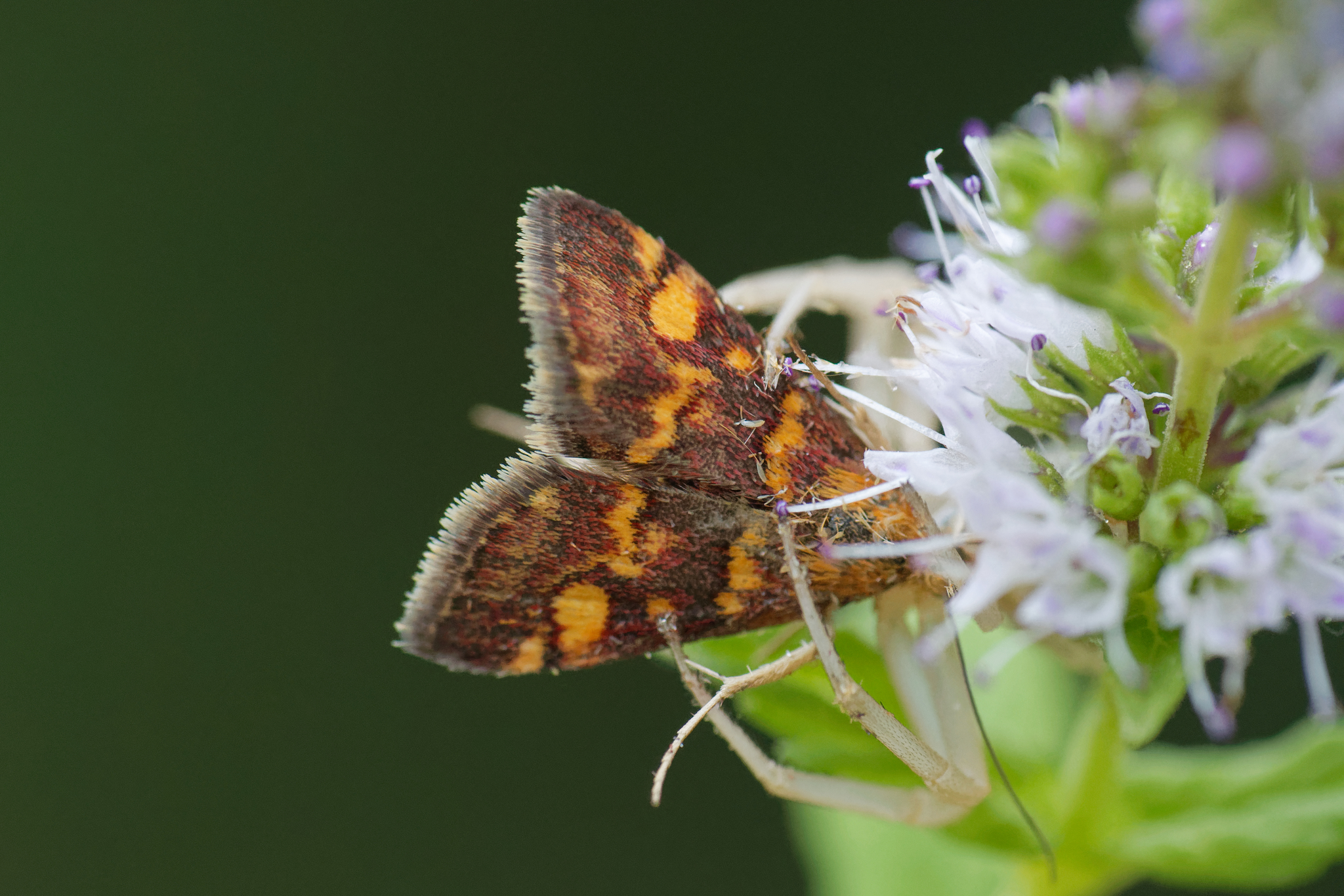 Pyrausta aurata | species | Mentha | genus | interactsWith | Animalia | Arthropoda | Insecta | Lepidoptera | Crambidae | Pyrausta | Plantae | Tracheophyta | Magnoliopsida | Lamiales | Lamiaceae | Mentha | 43.194059 | 6.009191 | 2020 | 8 | 5 | http://creativecommons.org/licenses/by-nc/4.0/ | https://www.inaturalist.org/observations/71935291 | |