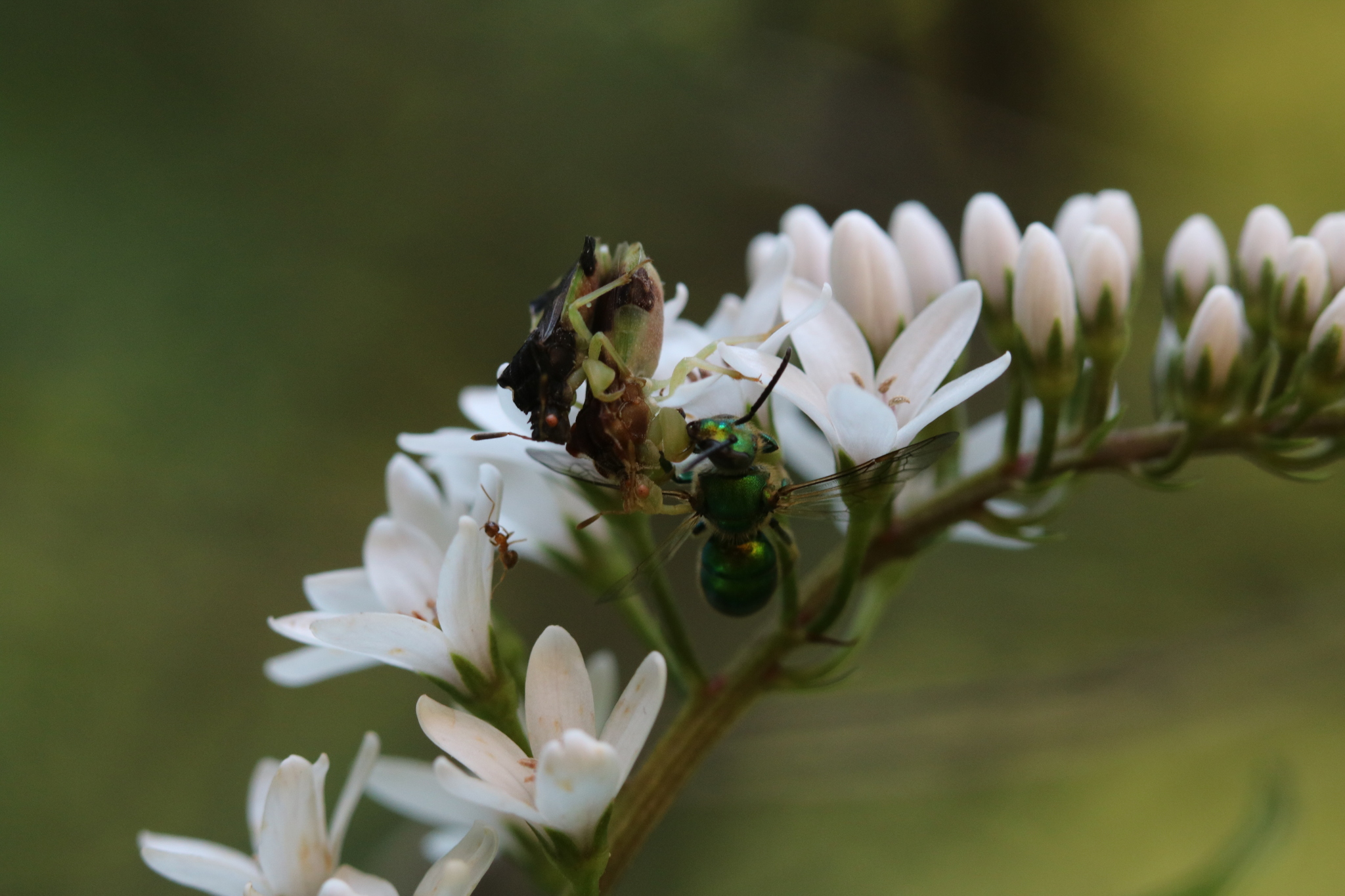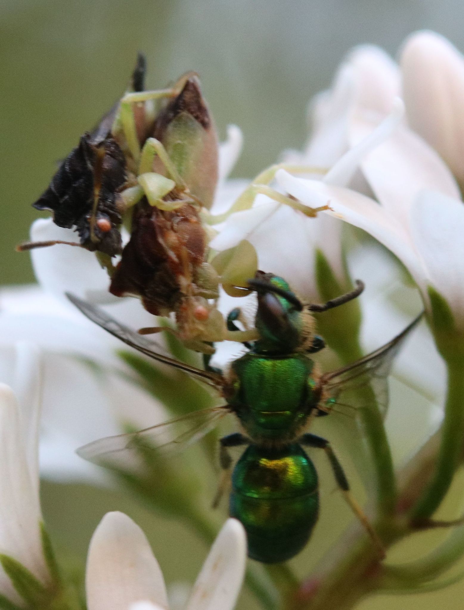 Augochloropsis viridula | species | Augochlora pura | species | preysOn | Animalia | Arthropoda | Insecta | Hymenoptera | Halictidae | Augochloropsis | Animalia | Arthropoda | Insecta | Hymenoptera | Halictidae | Augochlora | 41.134168 | -73.587373 | 2016 | 8 | 11 | http://creativecommons.org/licenses/by-nc/4.0/ | https://www.inaturalist.org/observations/71823025 | |
