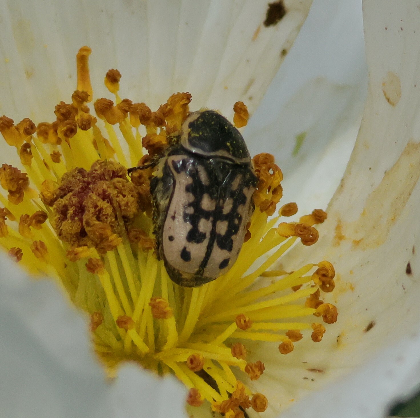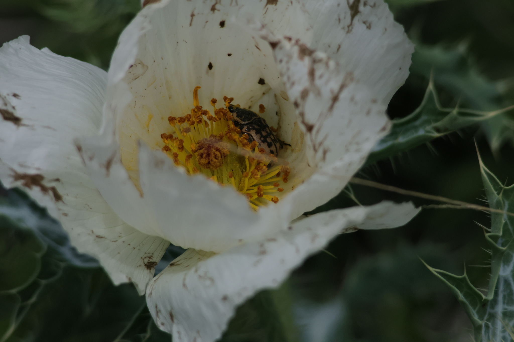 Euphoria kernii | species | Argemone polyanthemos | species | visits | Animalia | Arthropoda | Insecta | Coleoptera | Scarabaeidae | Euphoria | Plantae | Tracheophyta | Magnoliopsida | Ranunculales | Papaveraceae | Argemone | 33.622193 | -101.889546 | 2023 | 5 | 26 | http://creativecommons.org/licenses/by-nc/4.0/ | https://www.inaturalist.org/observations/163901167 | |