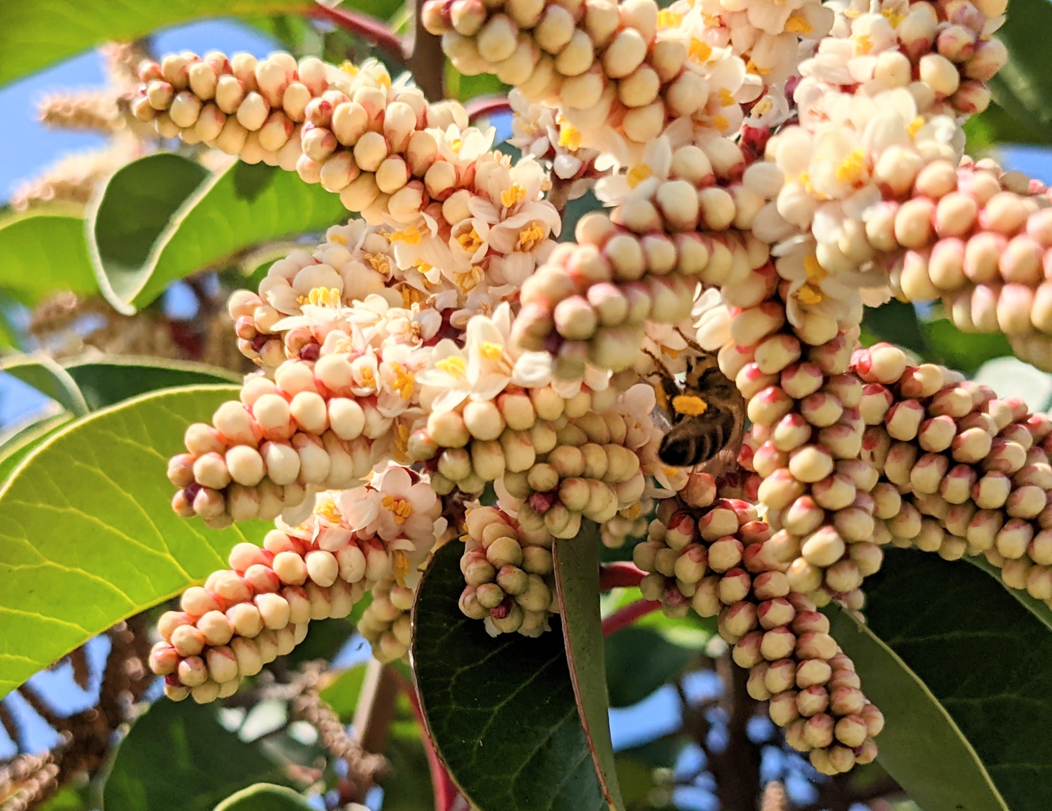Apis mellifera | species | Rhus ovata | species | eats | Animalia | Arthropoda | Insecta | Hymenoptera | Apidae | Apis | Plantae | Tracheophyta | Magnoliopsida | Sapindales | Anacardiaceae | Rhus | 37.263922 | -121.950475 | 2021 | 3 | 21 | http://creativecommons.org/licenses/by-nc/4.0/ | https://www.inaturalist.org/observations/71767045 | |