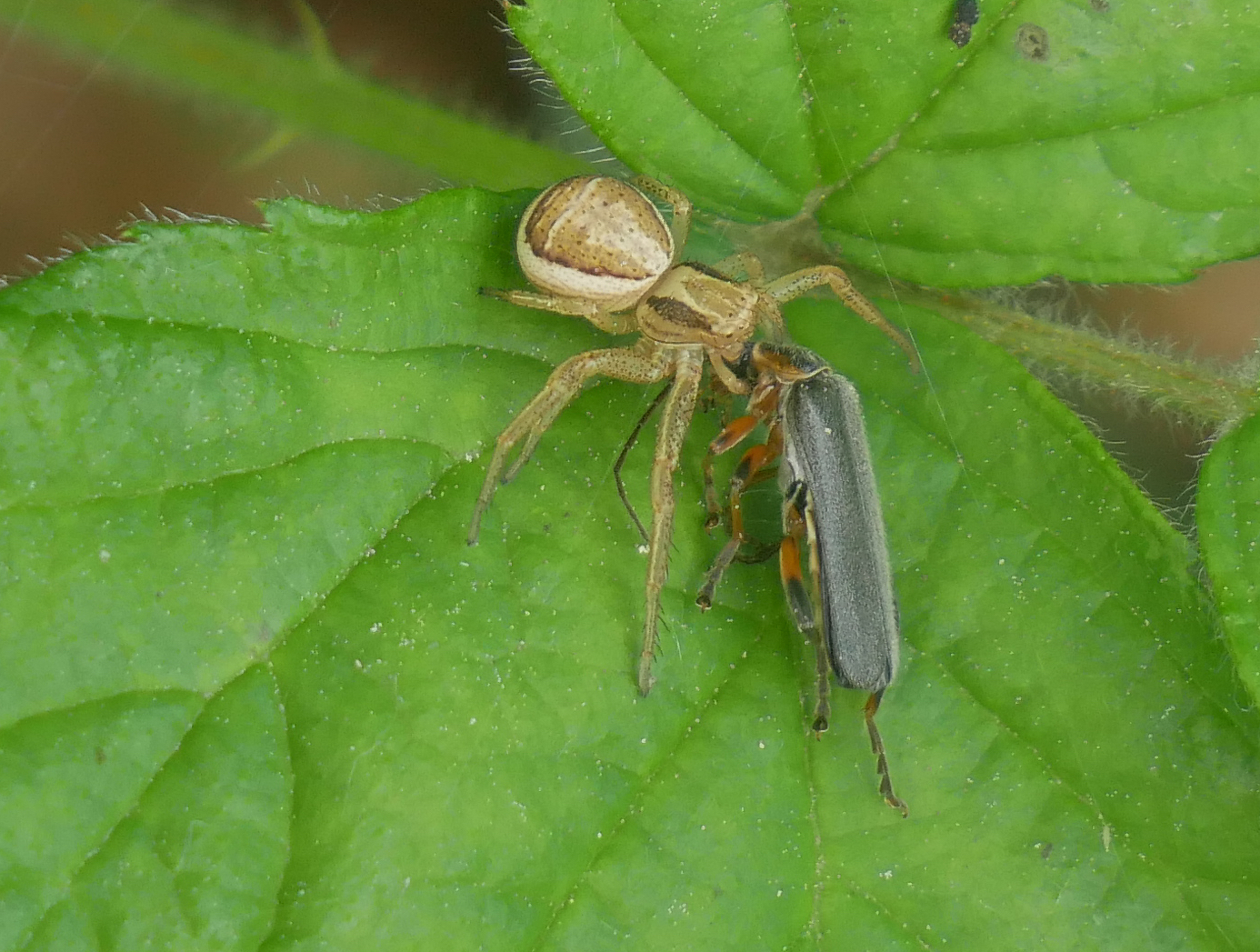 Xysticus ulmi | species | Cantharis | genus | preysOn | Animalia | Arthropoda | Arachnida | Araneae | Thomisidae | Xysticus | Animalia | Arthropoda | Insecta | Coleoptera | Cantharidae | Cantharis | 53.129245 | 9.804373 | 2023 | 5 | 26 | http://creativecommons.org/publicdomain/zero/1.0/ | https://www.inaturalist.org/observations/163851259 | |
