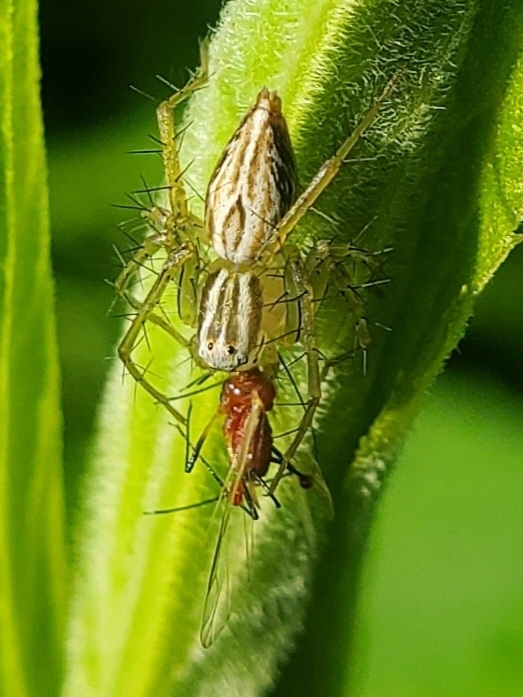 Oxyopes salticus | species | Solidago | genus | visits | Animalia | Arthropoda | Arachnida | Araneae | Oxyopidae | Oxyopes | Plantae | Tracheophyta | Magnoliopsida | Asterales | Asteraceae | Solidago | 36.000343 | -84.019731 | 2023 | 5 | 21 | http://creativecommons.org/licenses/by/4.0/ | https://www.inaturalist.org/observations/163008950 | |