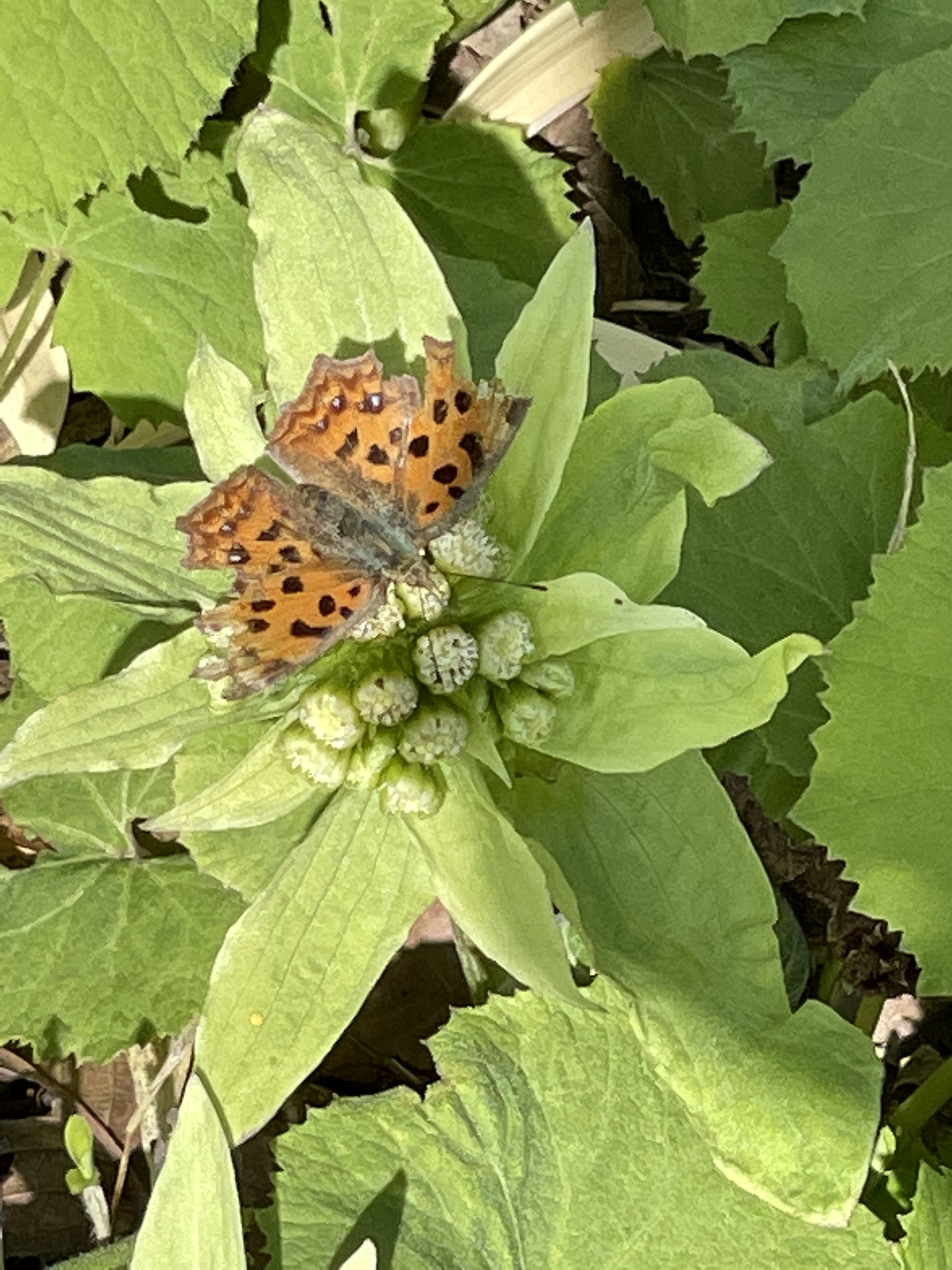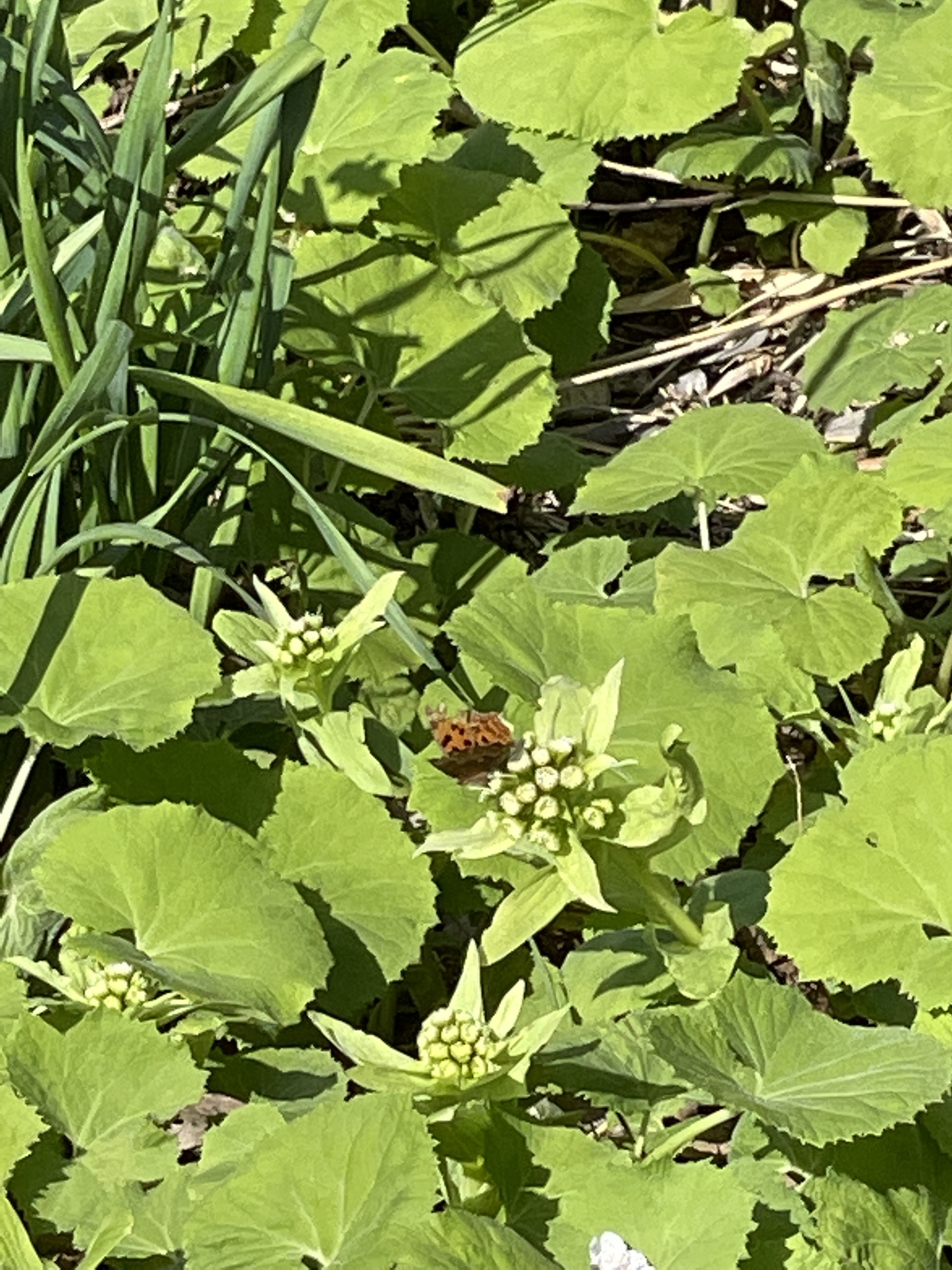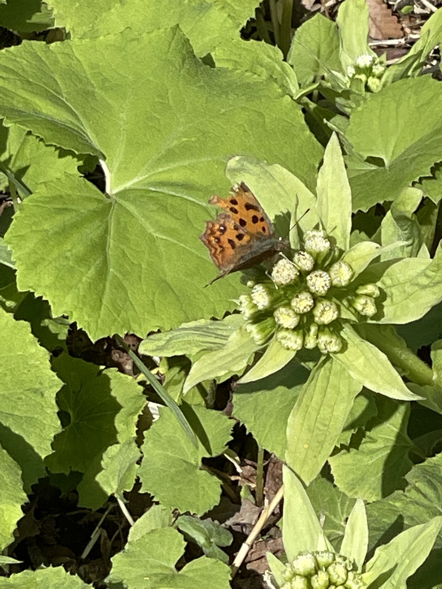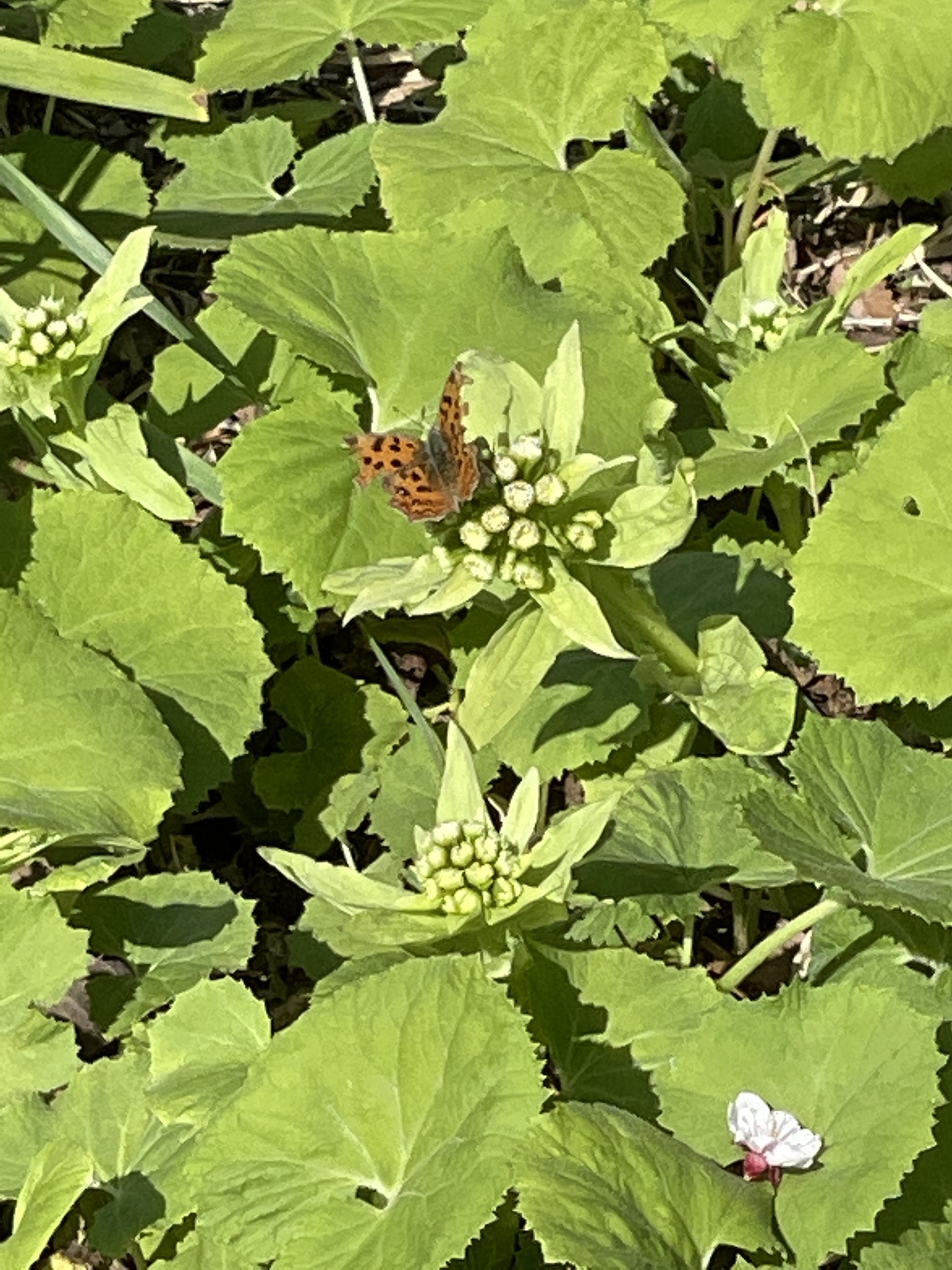 Polygonia c-aureum | species | Petasites japonicus | species | visits | Animalia | Arthropoda | Insecta | Lepidoptera | Nymphalidae | Polygonia | Plantae | Tracheophyta | Magnoliopsida | Asterales | Asteraceae | Petasites | 35.347243 | 139.61377 | 2021 | 3 | 11 | http://creativecommons.org/licenses/by-nc/4.0/ | https://www.inaturalist.org/observations/70979809 | |