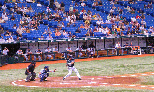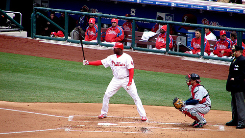 A baseball player standing at the plate holding a bat in one hand.