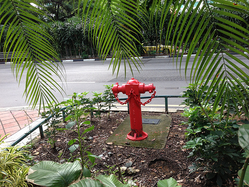 a red fire hydrant surrounded by green plants