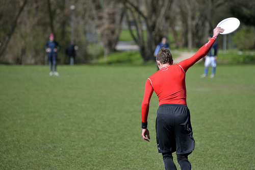 A man is playing Frisbee with a group of other people.