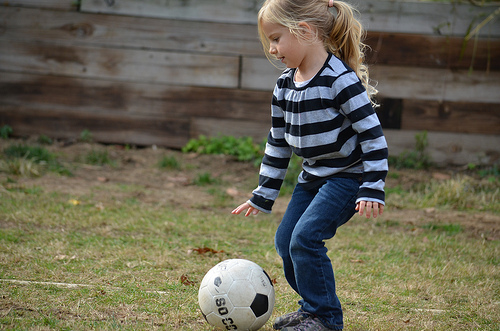 A little girl playing outside with a soccer ball.