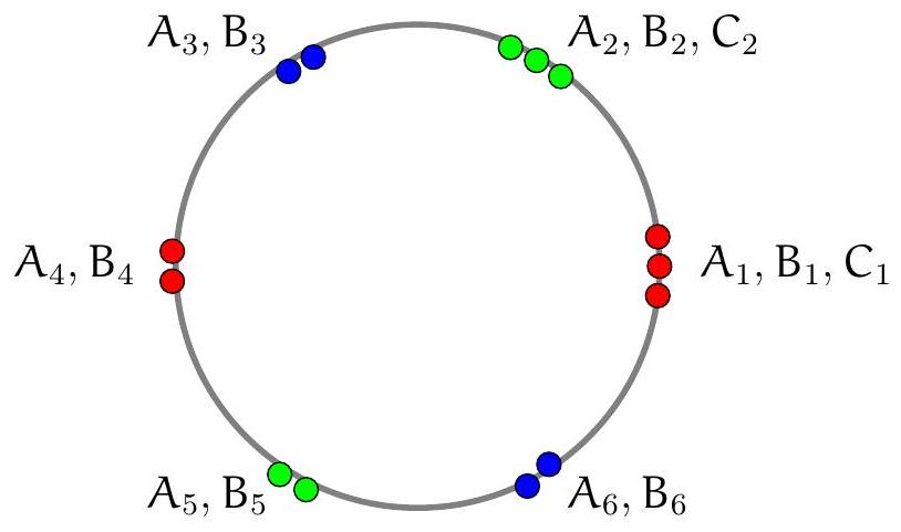 Nous allons traiter ce problème avec le langage des graphes. La modélisation du problème pousse à considérer le graphe dont les sommets sont les éléments de $S$, qui sont reliés par une arête de couleur $i$ si les deux sommets apprtiennent à l'ensemble $A_{i}$.