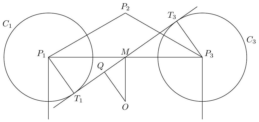 Without loss of generality, let's only consider $\ell_{1}$. Let $M$ be the midpoint of $P_{1} P_{3}$ and let $T_{1}$ and $T_{3}$ be the tangency points between $\ell_{1}$ and $C_{1}$ and $C_{3}$, respectively. Without loss of generality, assume $T_{1}$ is closer to $O$ than $T_{3}$. Finally, let $Q$ be the projection of $O$ onto $\ell_{1}$, so that $h=O Q$.