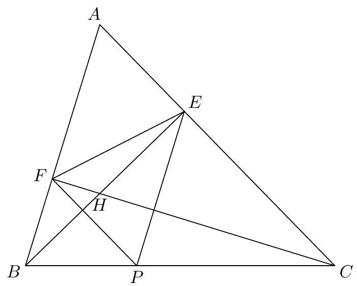 Let $P$ be the orthocenter of $\triangle E H F$. Then $E H \perp F P$ and $E H \perp A C$, so $F P$ is parallel to $A C$. Similarly, $E P$ is parallel to $A B$. Using similar triangles gives