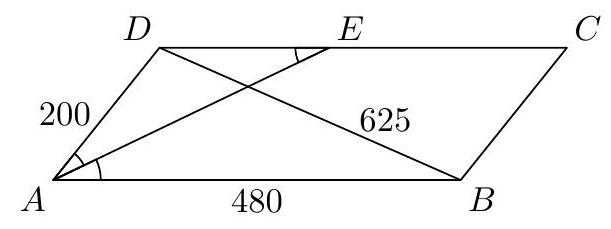 Let $A B C D$ be a parallelogram with $A B=480, A D=200$, and $B D=625$. The angle bisector of $\angle B A D$ meets side $C D$ at point $E$. Find $C E$.