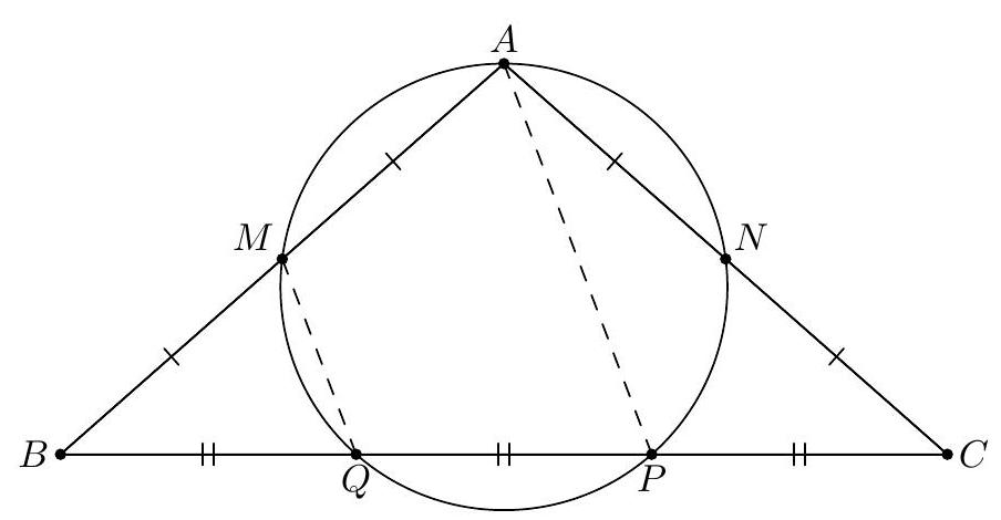 In triangle $A B C$, points $M$ and $N$ are the midpoints of $A B$ and $A C$, respectively, and points $P$ and $Q$ trisect $B C$. Given that $A, M, N, P$, and $Q$ lie on a circle and $B C=1$, compute the area of triangle $A B C$.